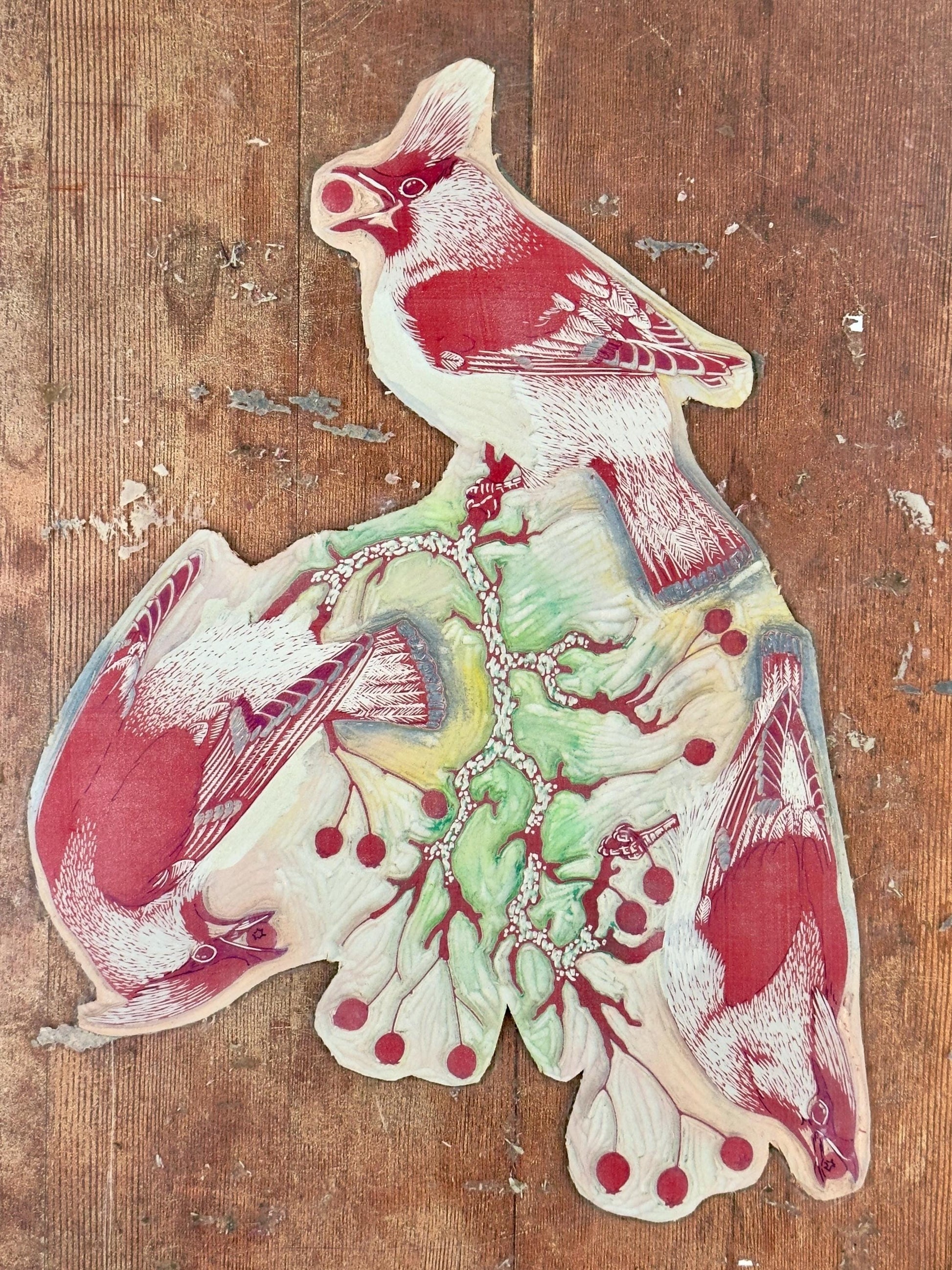 A Museum of Waxwings - original linocut print of Bohemian Waxwings