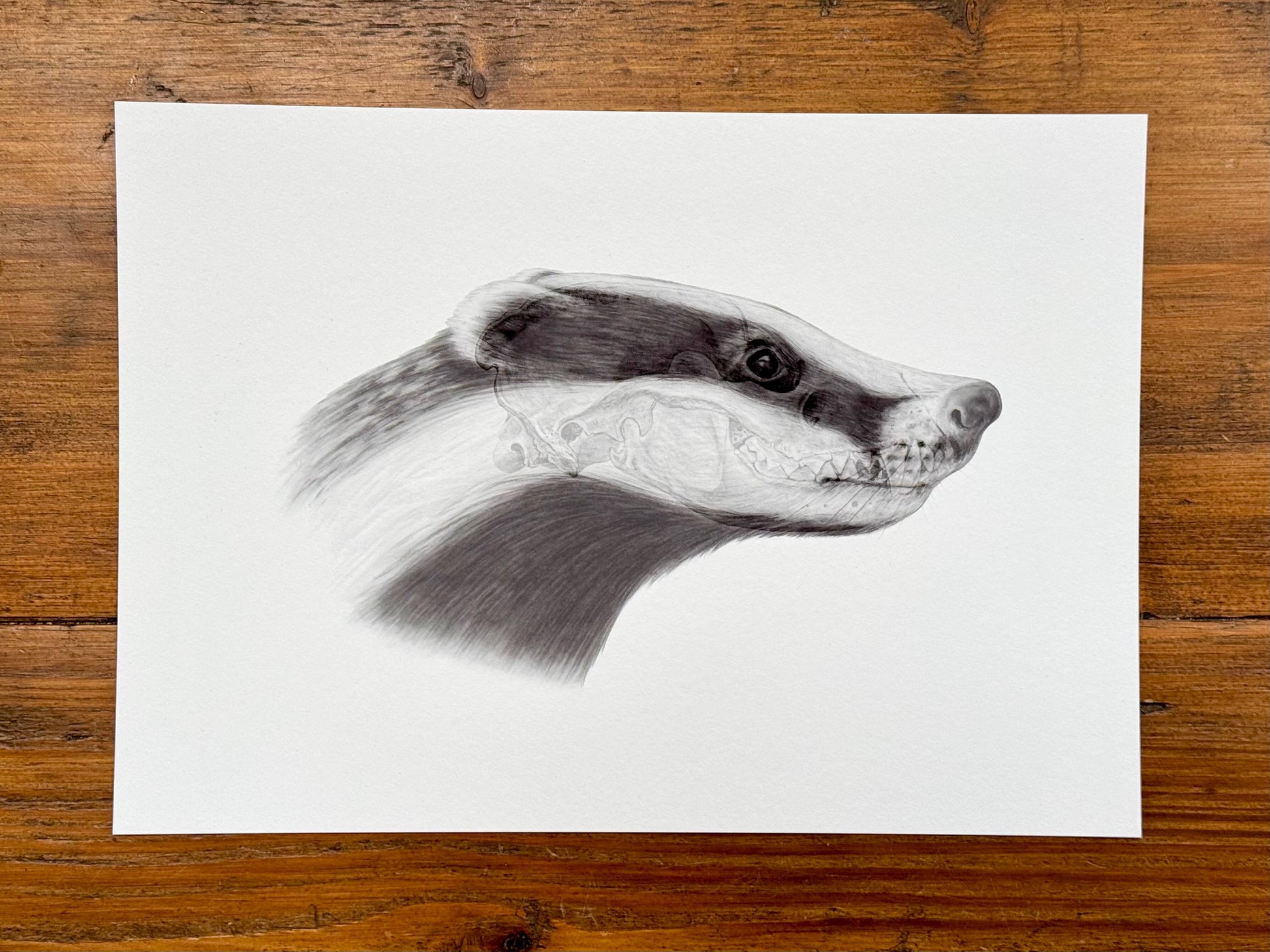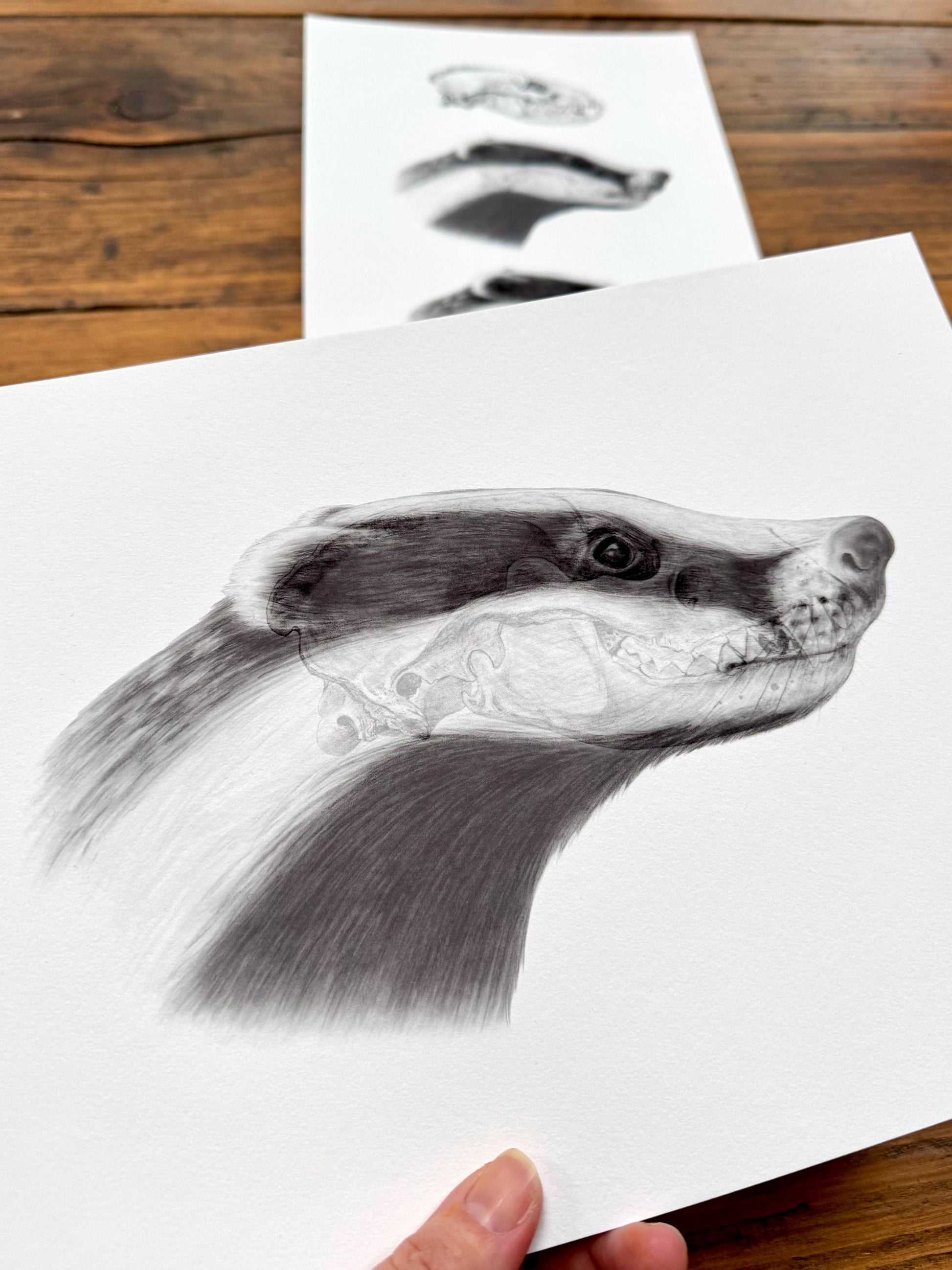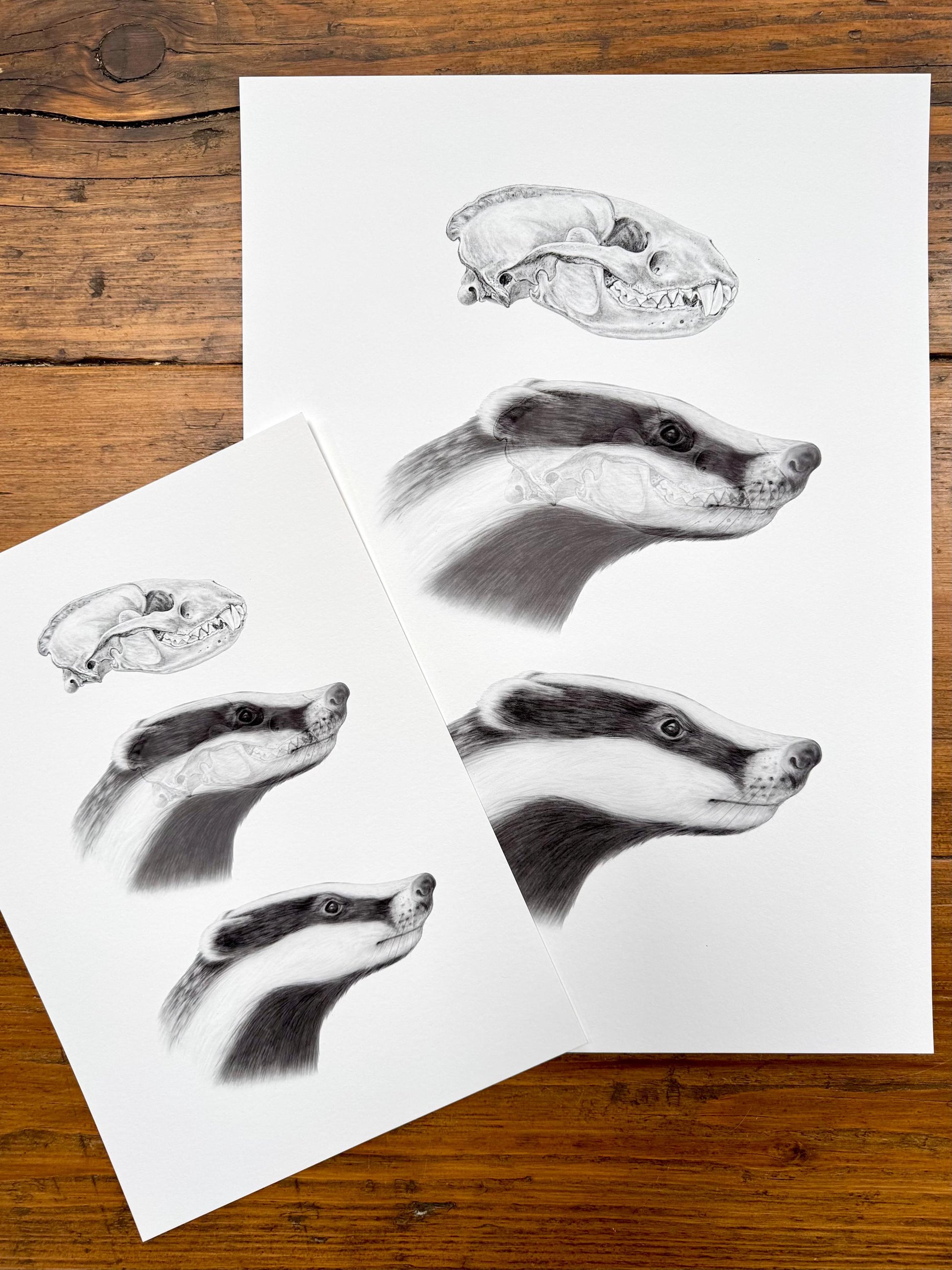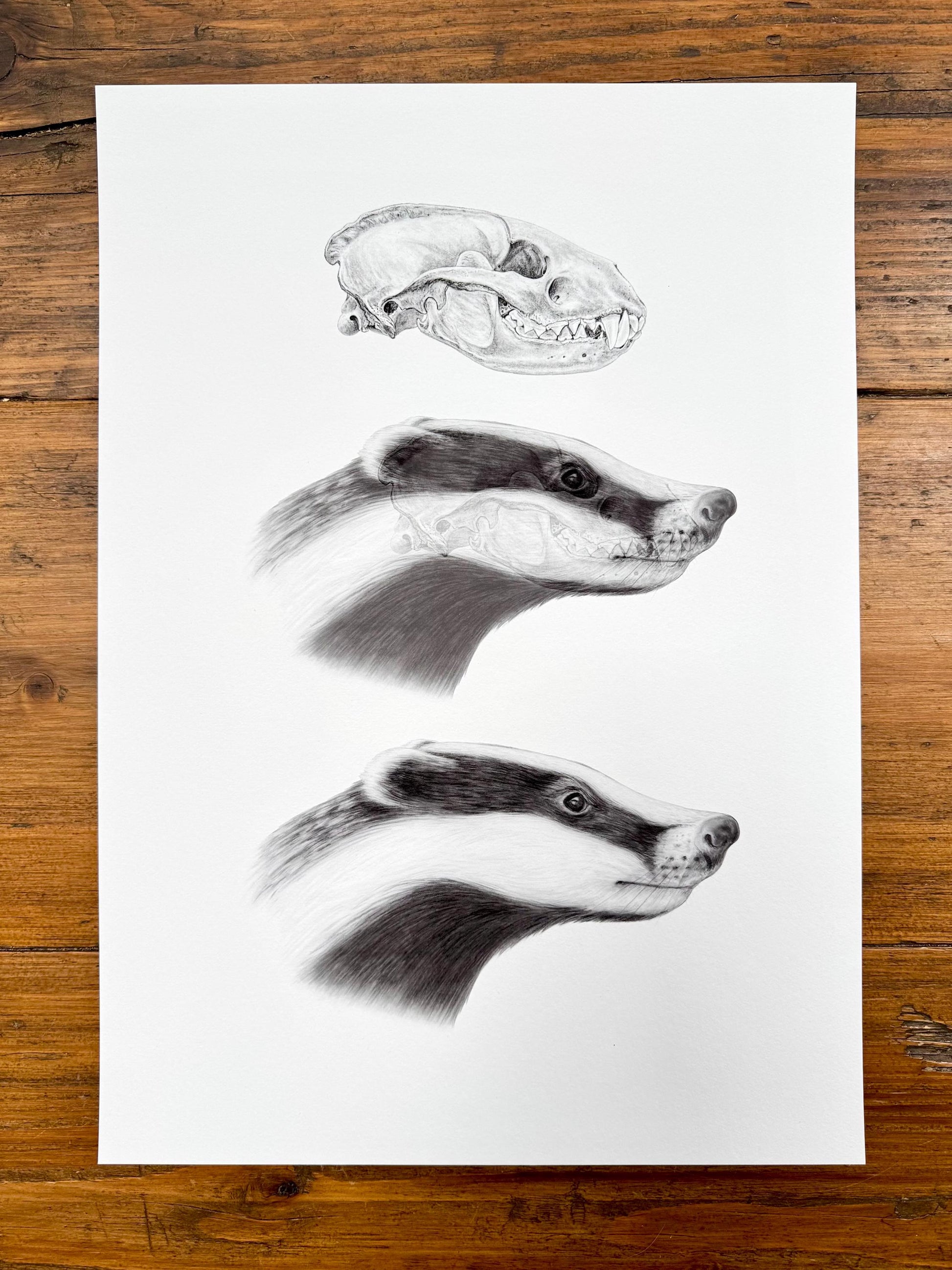 High quality Giclée reproduction (archival digital print) of drawings of a badger skull and badger. The original drawings were created in graphite pencil on hot pressed watercolour paper (skull) and drafting film (badger face). These prints of the original artwork are created to the highest standards, and are printed on Hahnemühle 350 gsm museum etching paper - 100% Rag Paper with a subtle surface texture. Signed on the front. Please note these prints are unmounted and unframed.