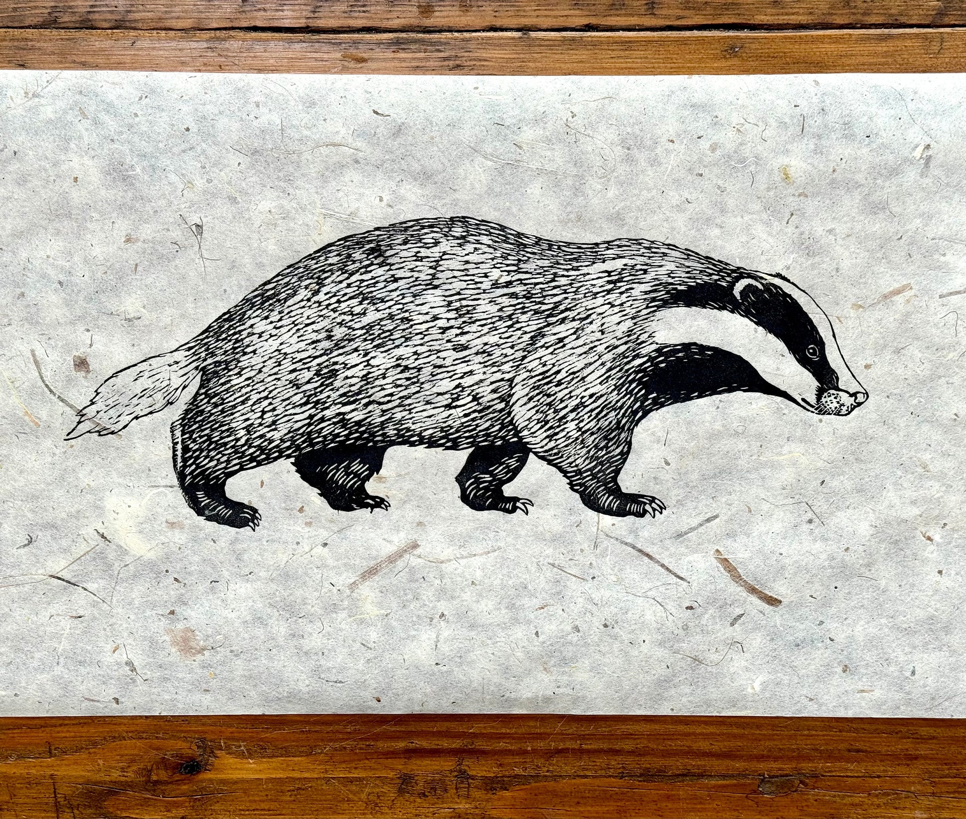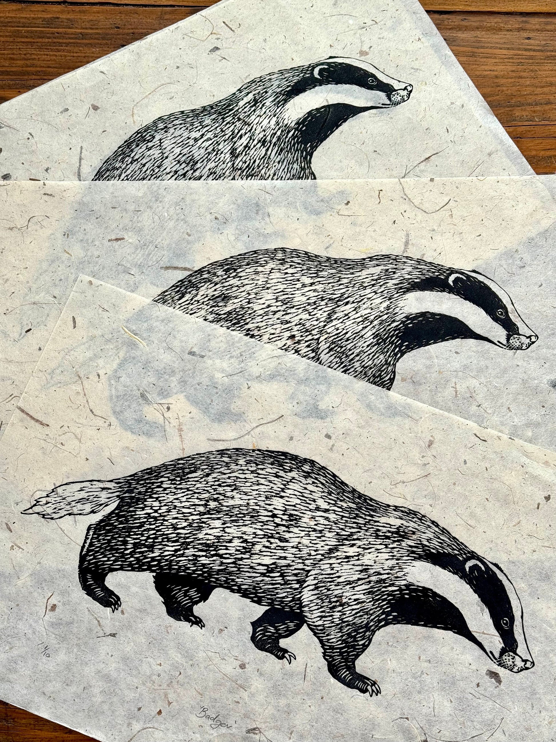 This is a hand printed linocut print of a badger. Printed on 40gsm acid free Thai Mulberry paper with Cranfield Caligo safe wash oil-based ink. Signed on the front. This is a limited edition of 10 prints. Please note this print is unmounted and unframed.