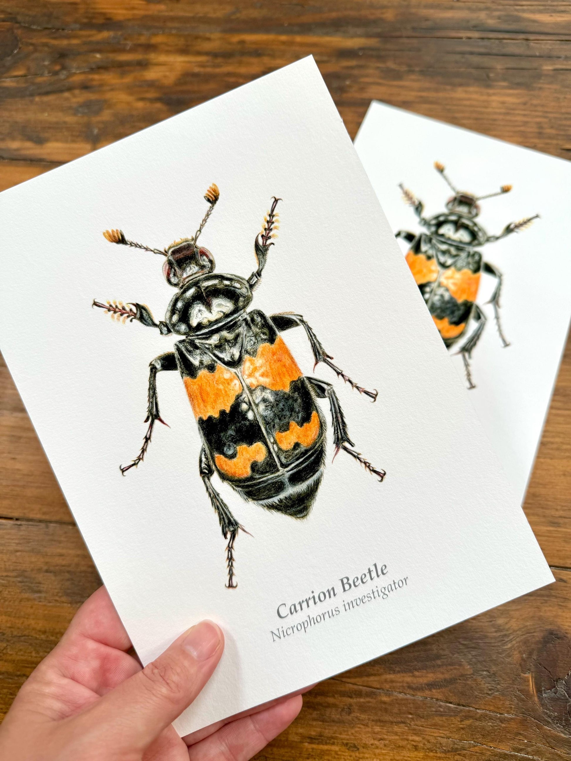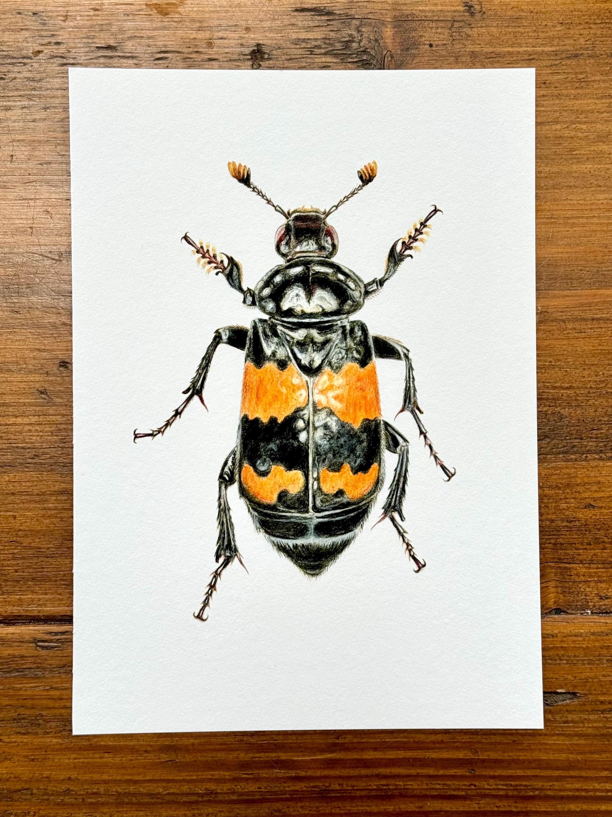 High quality Giclée reproduction (archival digital print) of a carrion beetle. The original was created using coloured pencil on hot pressed watercolour paper. These prints of the original artwork are created to the highest standards, and are printed on Hahnemühle 350 gsm museum etching paper - 100% Rag Paper with a subtle surface texture. Signed on the front. Please note this is print is unmounted and unframed.