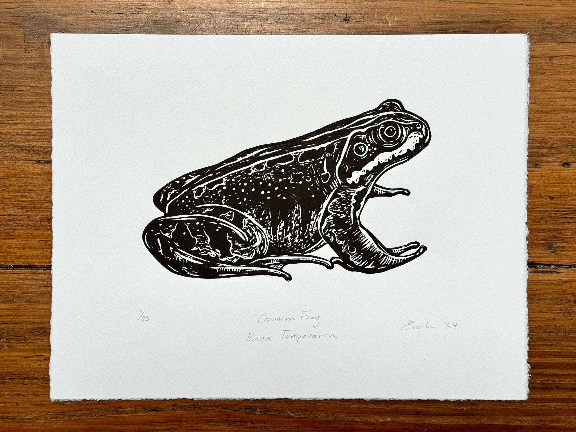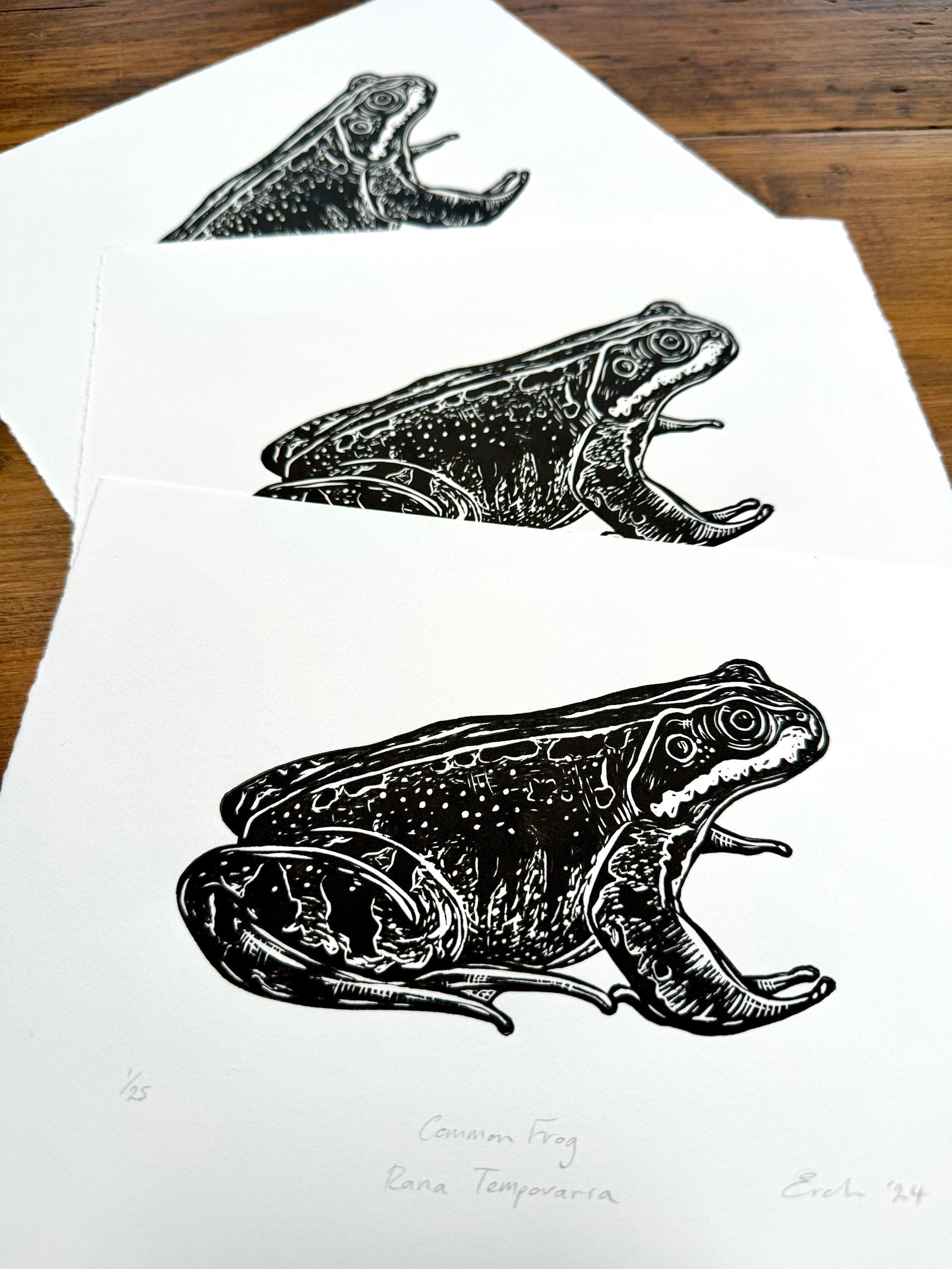 This is a hand made linocut print of a common frog, printed onto acid free Somerset Satin 250gsm paper with Cranfield Caligo safe wash oil-based ink. Frogs and toads are some of my favourite animals and often feature in my work. This is a limited edition of 25 prints. Please note this print is unmounted and unframed.