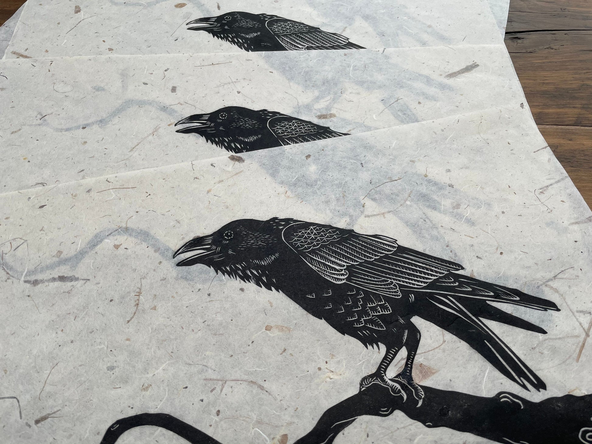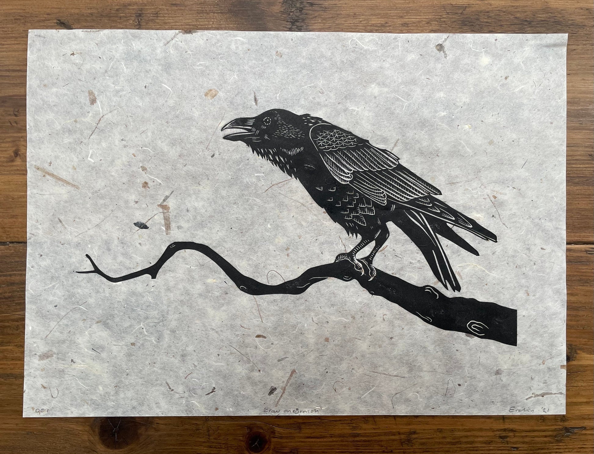 Hand printed lino cut of a crow/raven on a branch. Printed on 40gsm acid free Thai Mulberry paper with Cranfield Caligo safe wash oil-based ink. This paper is very thin but very strong. Signed on the front. Please note this print is unmounted and unframed.