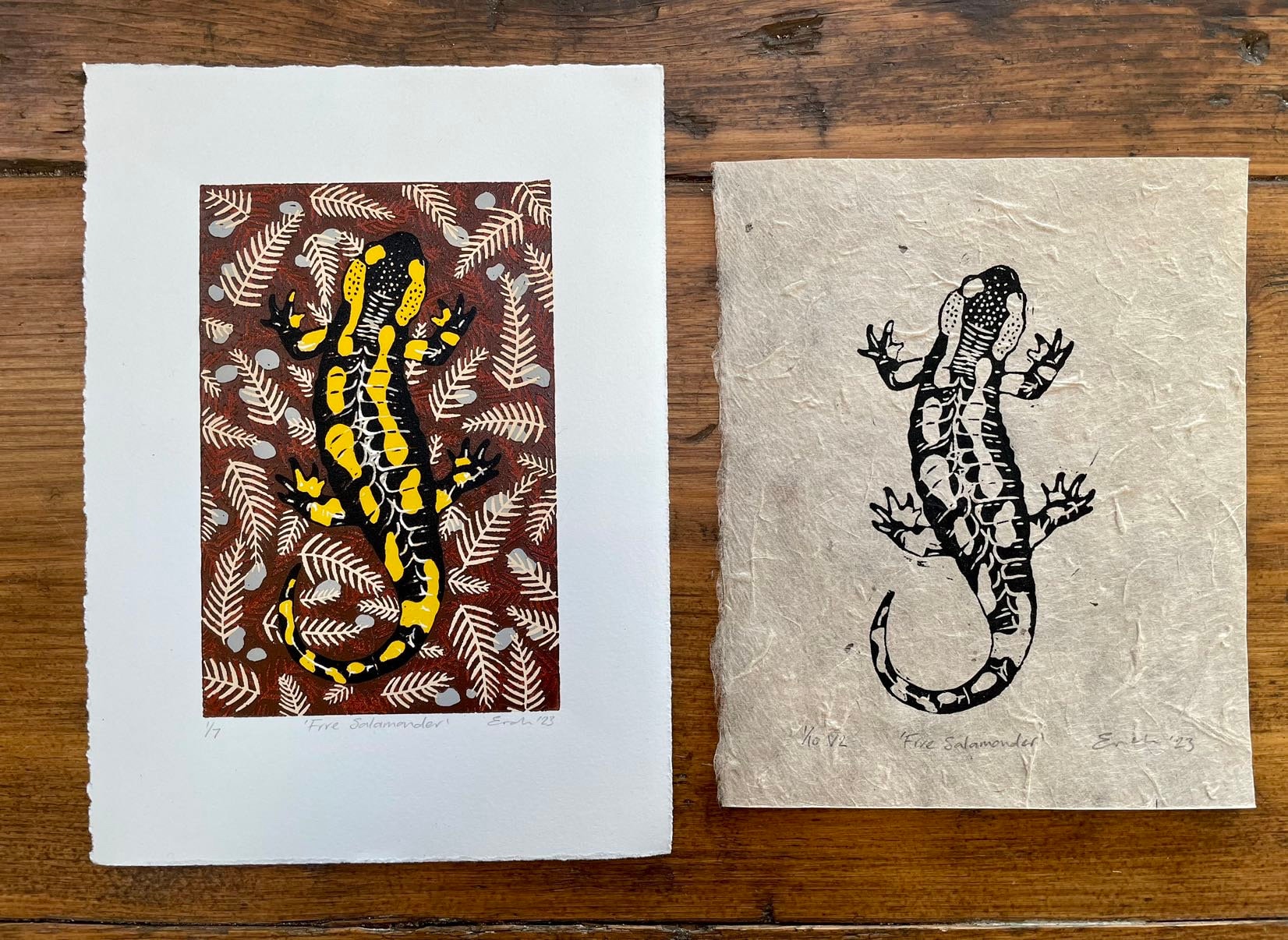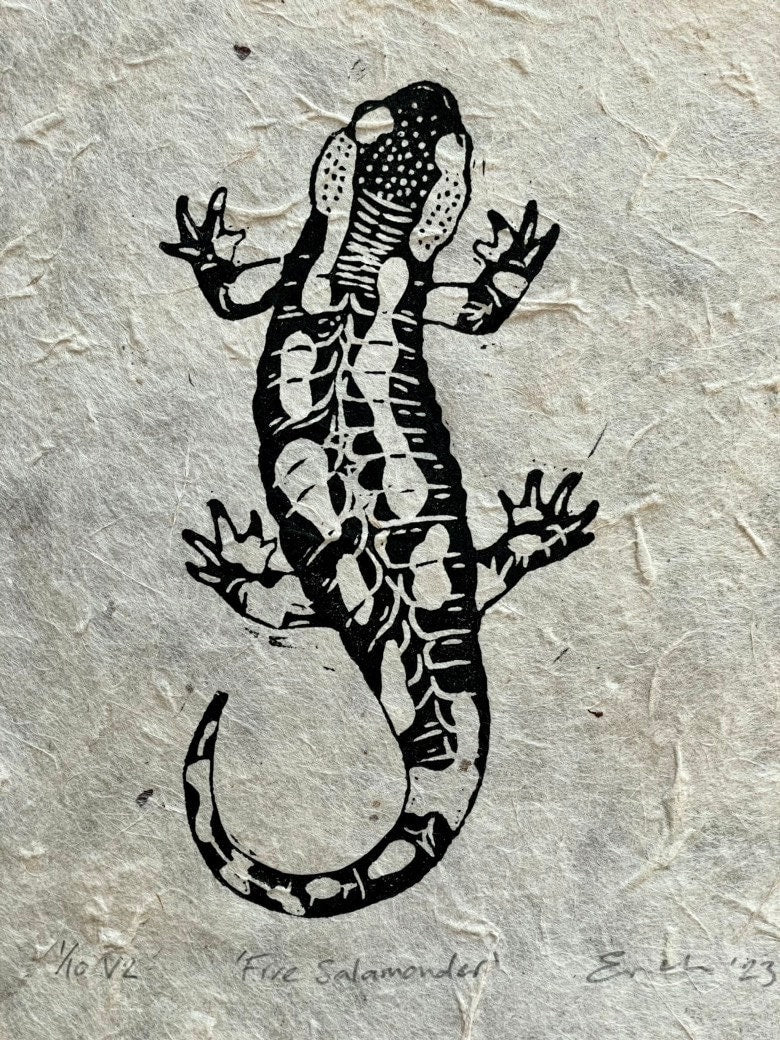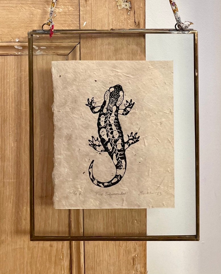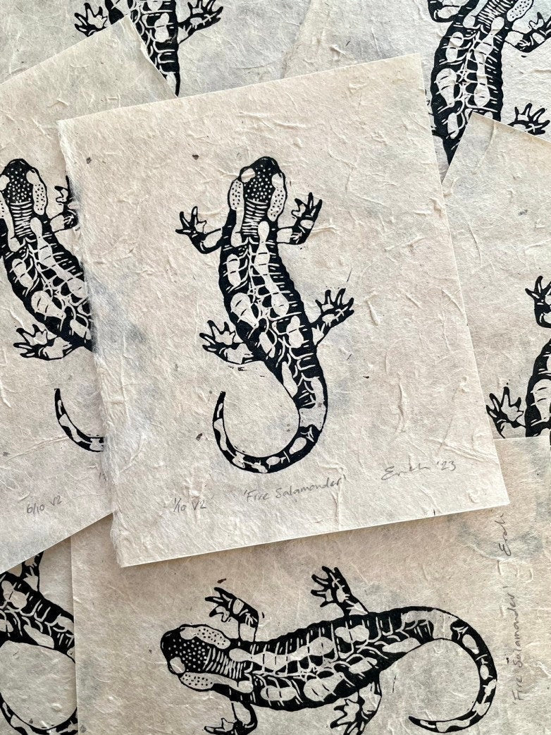 This is a hand made linocut print of a fire salamander. There are two versions of this print available, this listing is for the single colour (black) print on Napalese Lokta paper. There is also a six colour reduction linocut available. Both editions are signed and numbered on the front.