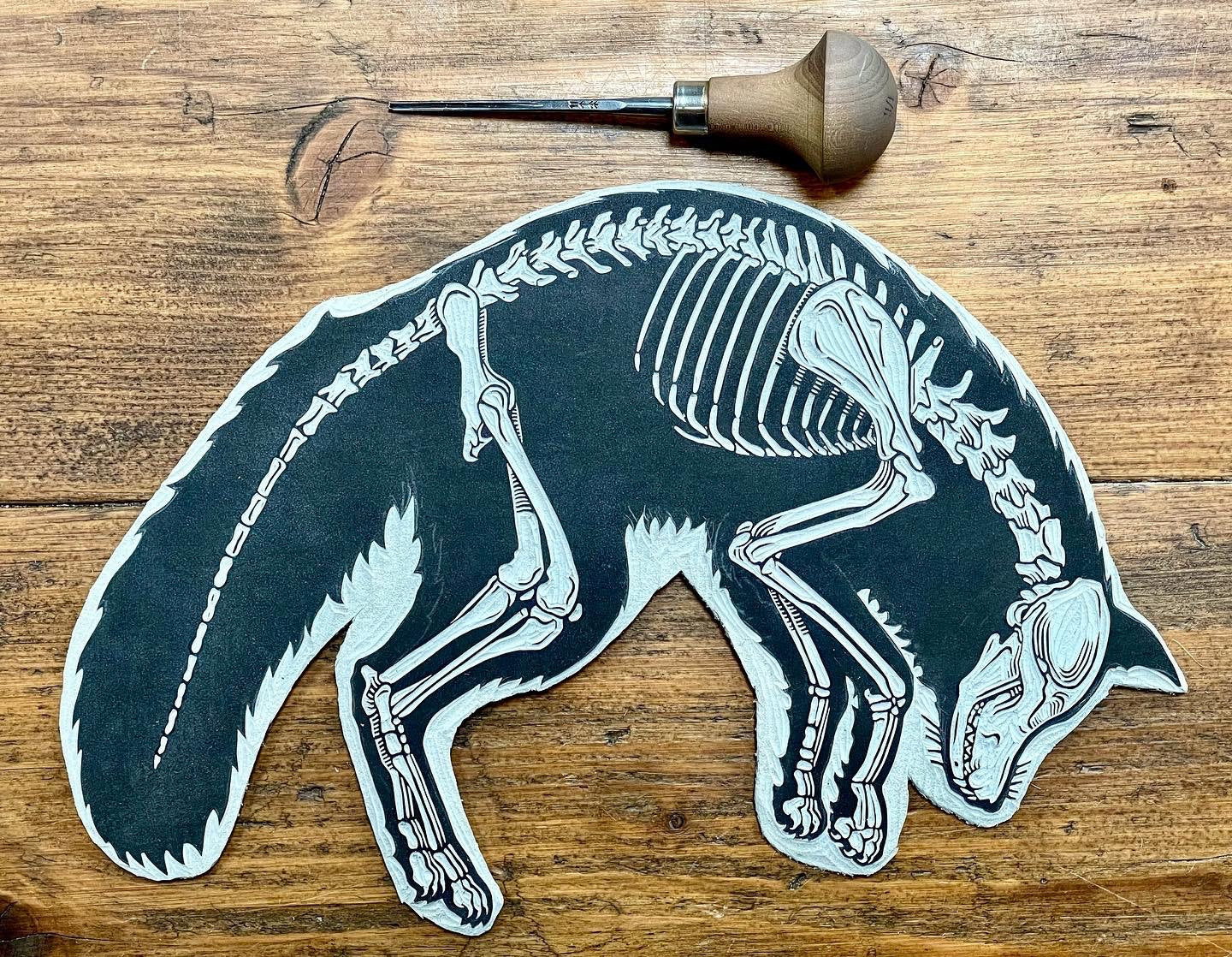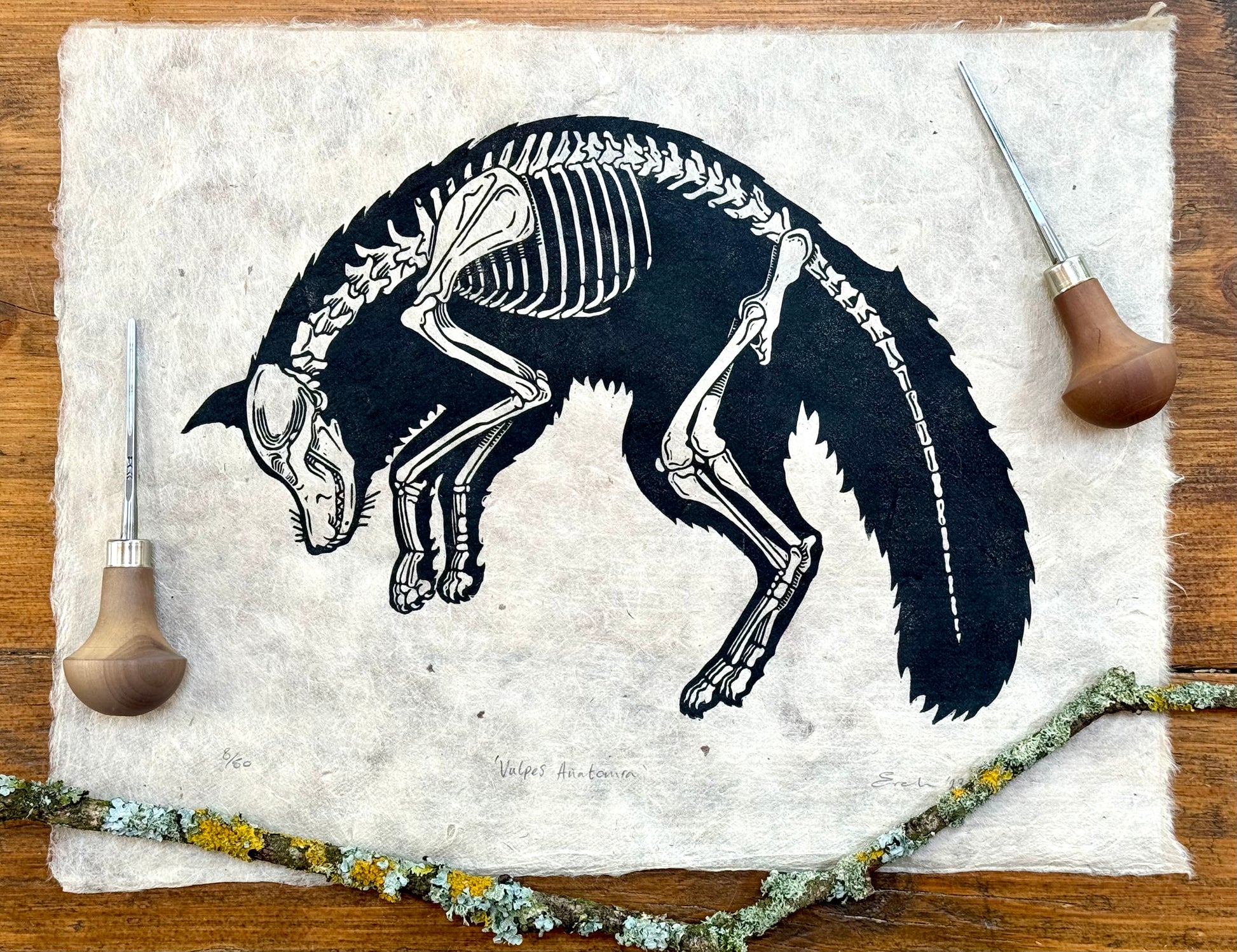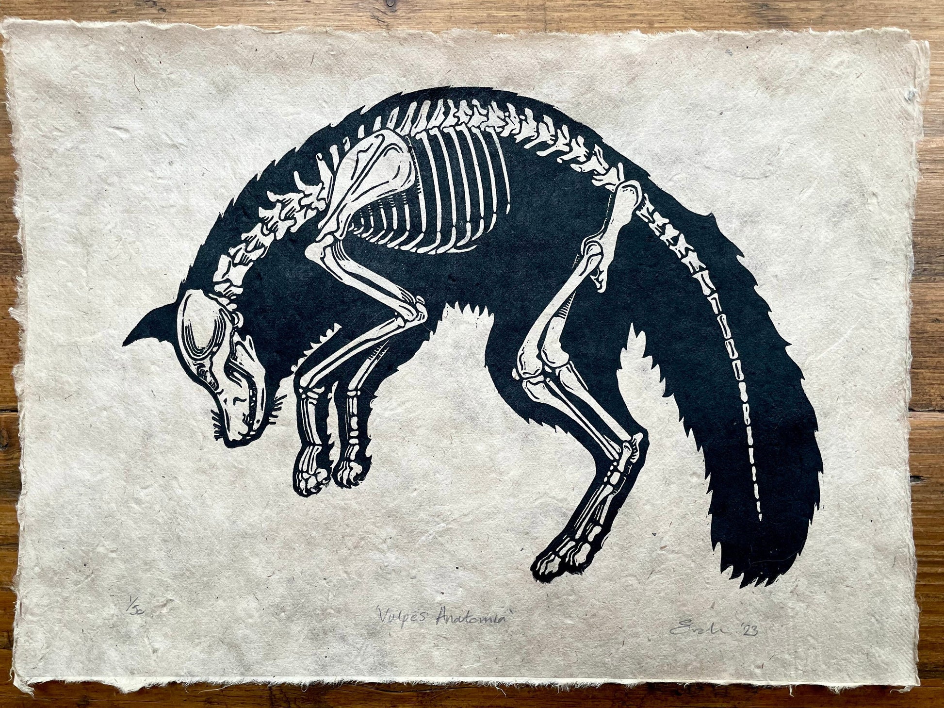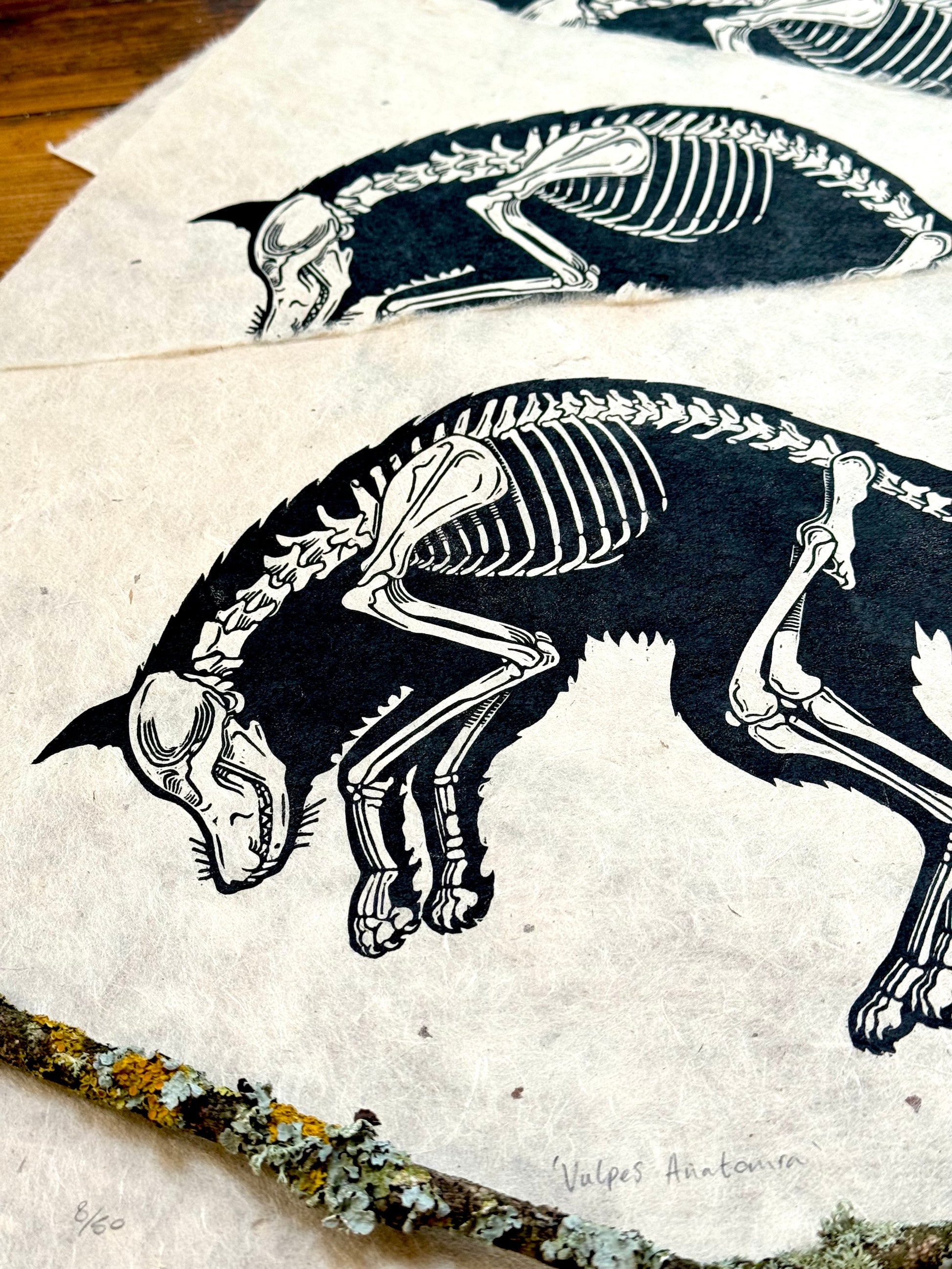 'Vulpes Anatomia’ is a hand printed lino cut of a fox/fox skeleton. Part of a series of prints exploring the cycle of the life and death in animals.