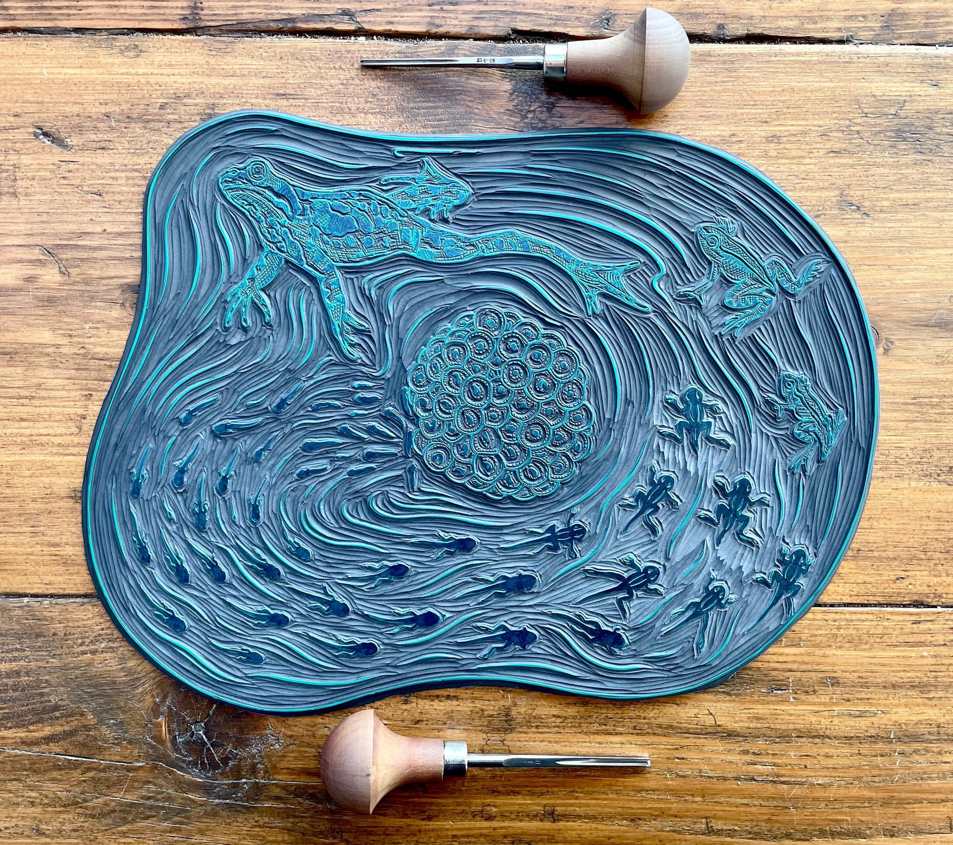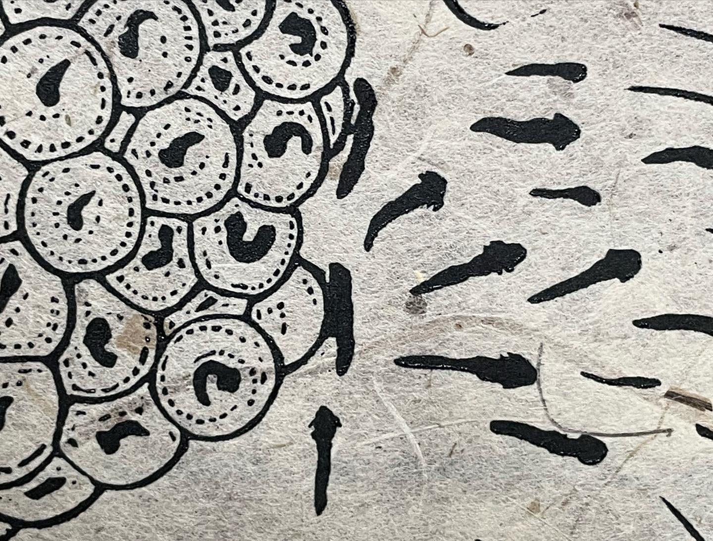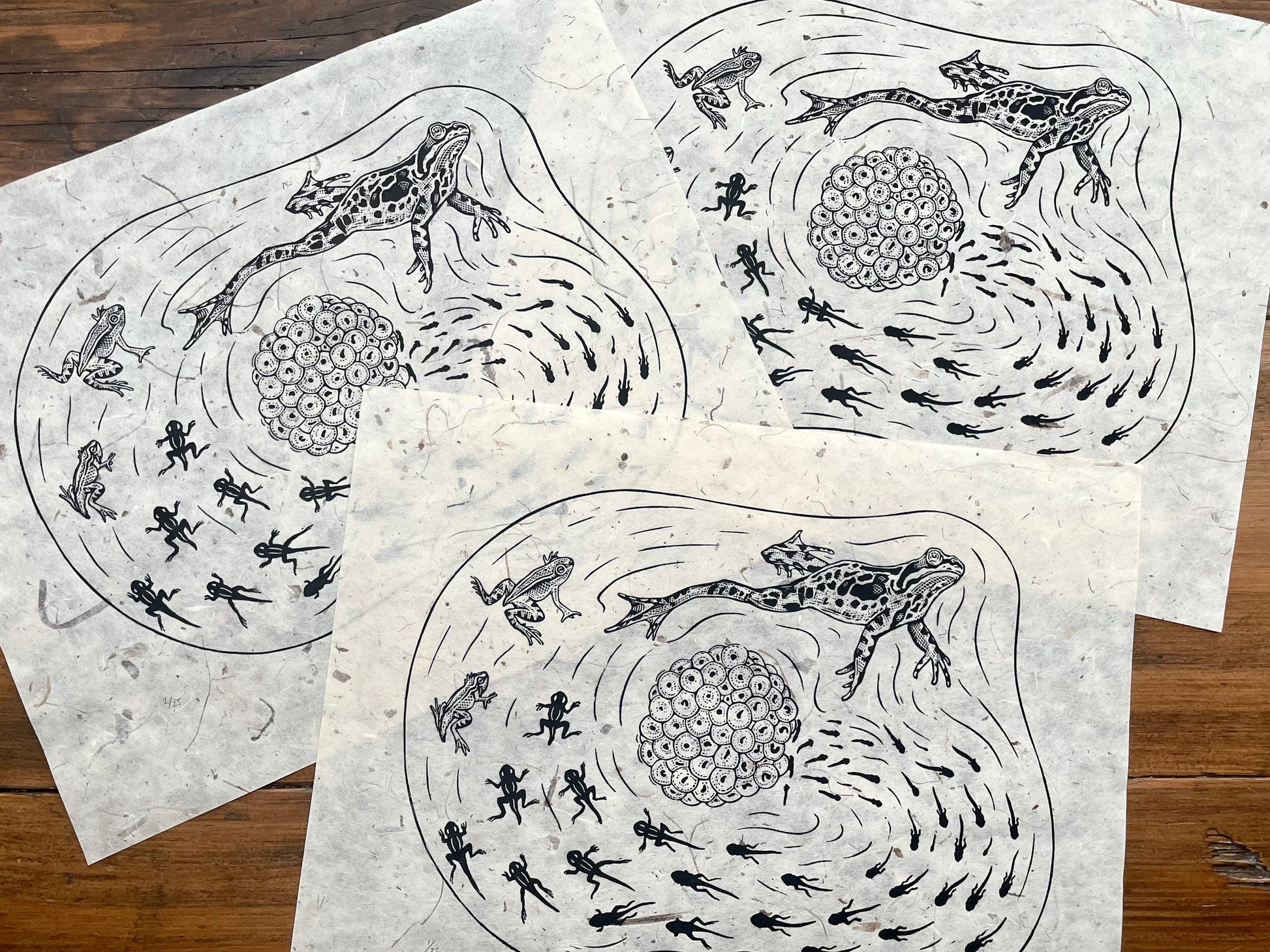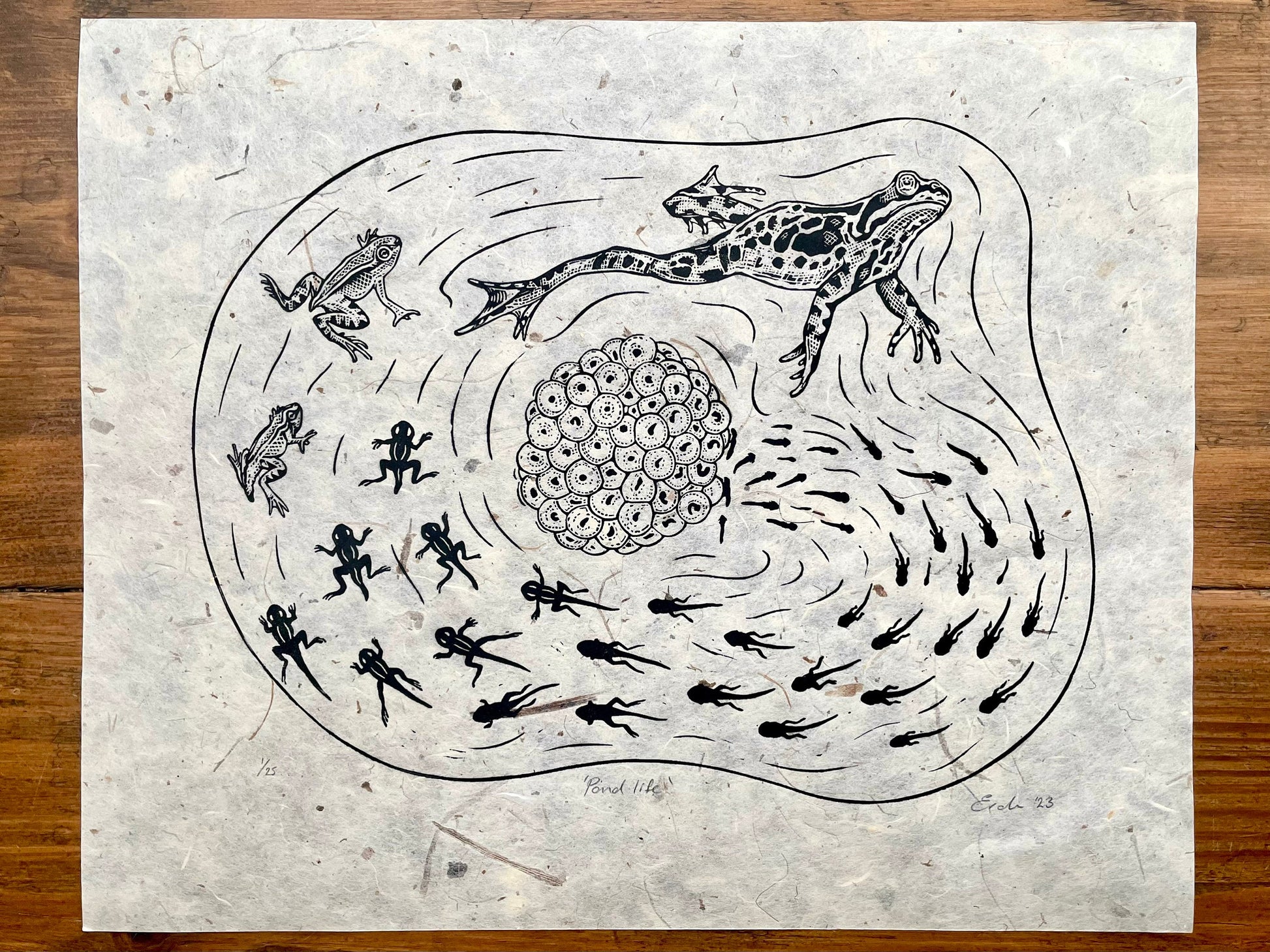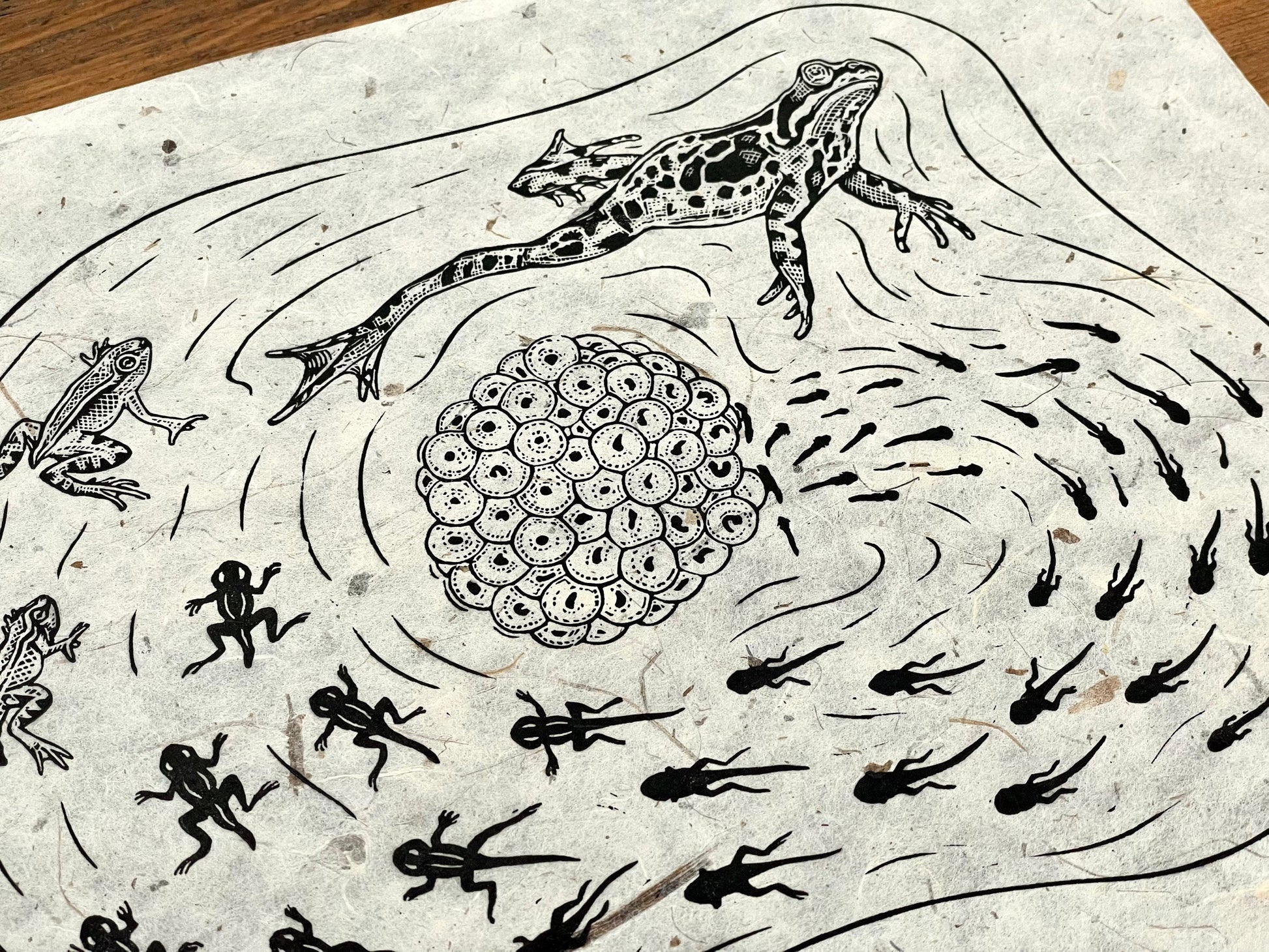 Hand printed linocut print of the life cycle of the common frog. Printed on 40gsm acid free Thai Mulberry paper with Cranfield Caligo safe wash oil-based ink. This paper is very thin but very strong. Signed on the front. This is a limited edition of 25 prints. Please note this print is unmounted and unframed. There is also a colour version available as a limited edition of 7 prints.