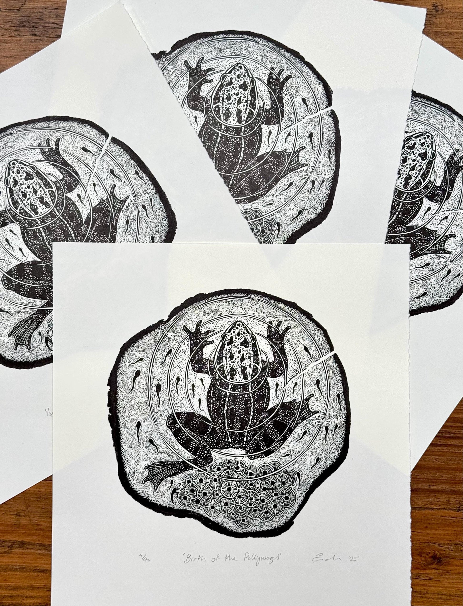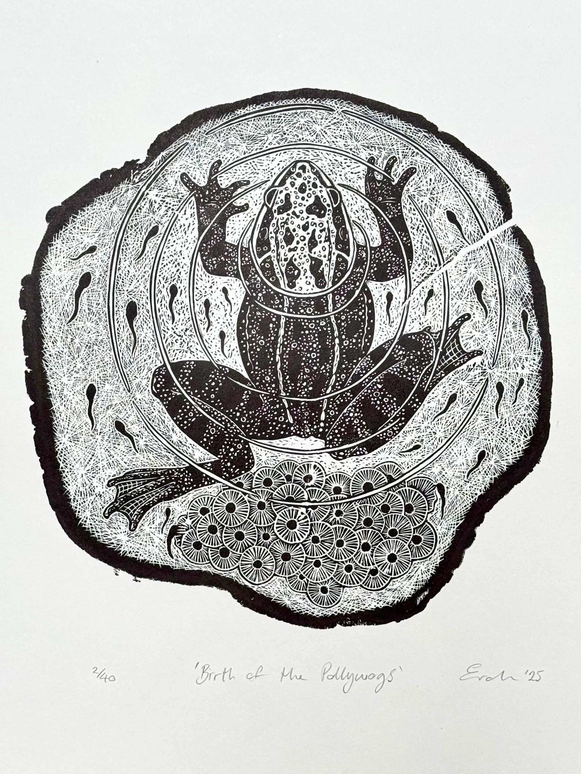 An original wood engraving of a frog with her frogspawn and tadpoles - or pollywogs as they are also known. The word Pollywog comes from Middle English "polwygle," combining "pol" (meaning "head") and "wiglen" (meaning "to wiggle"). Engraved into a natural round of boxwood.