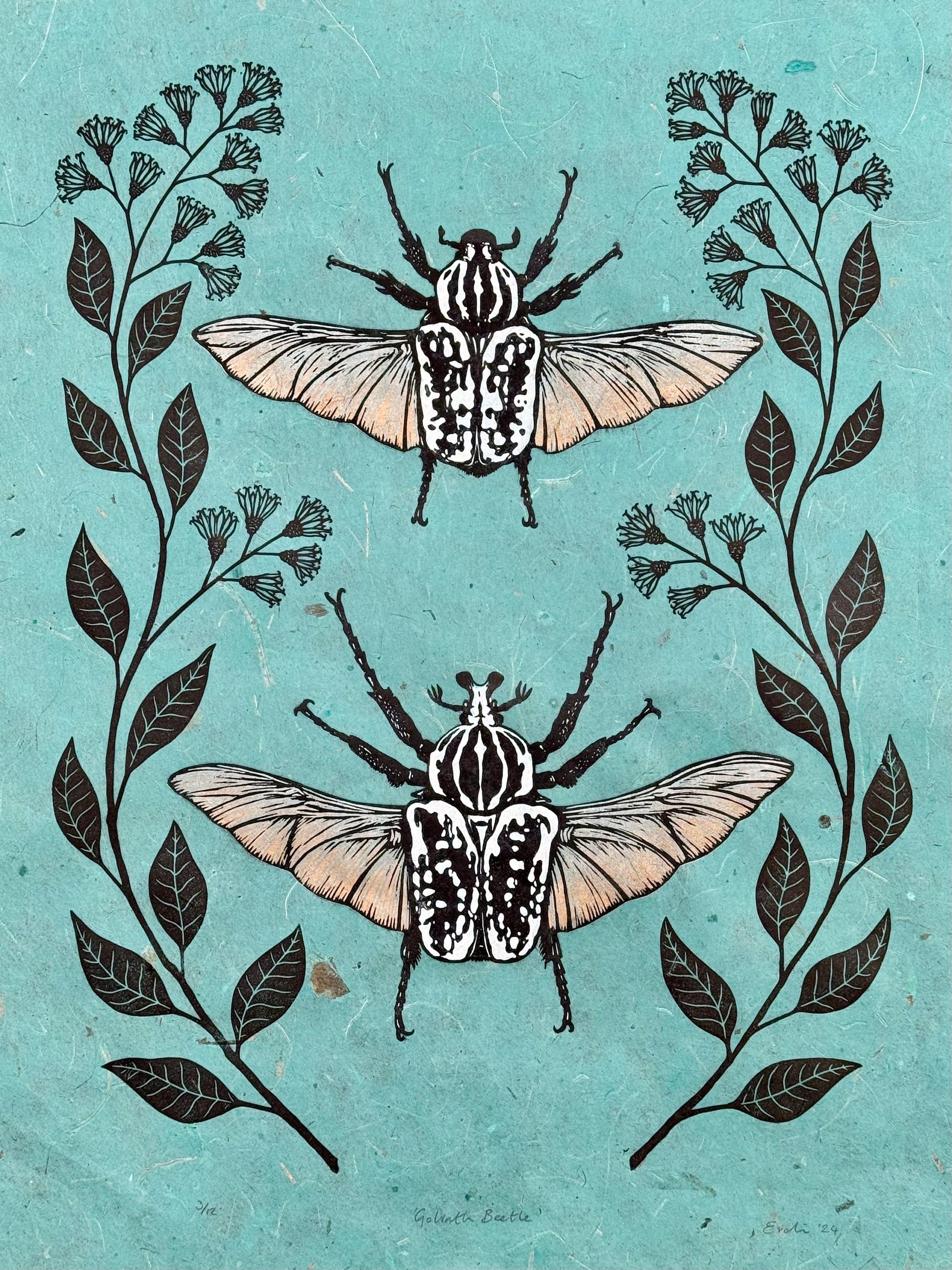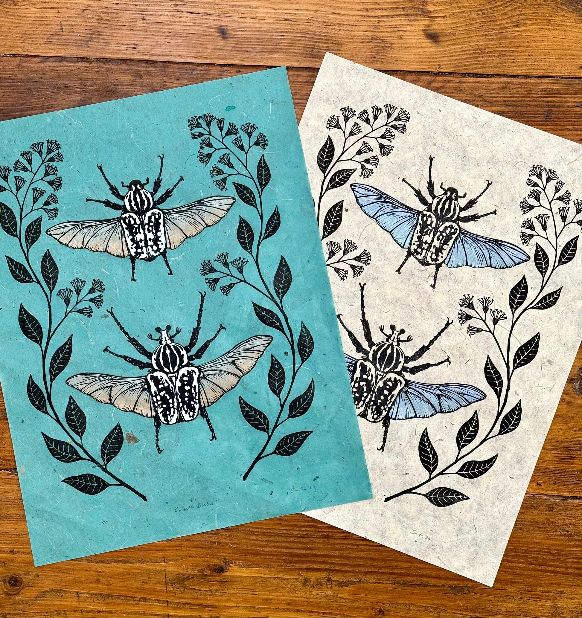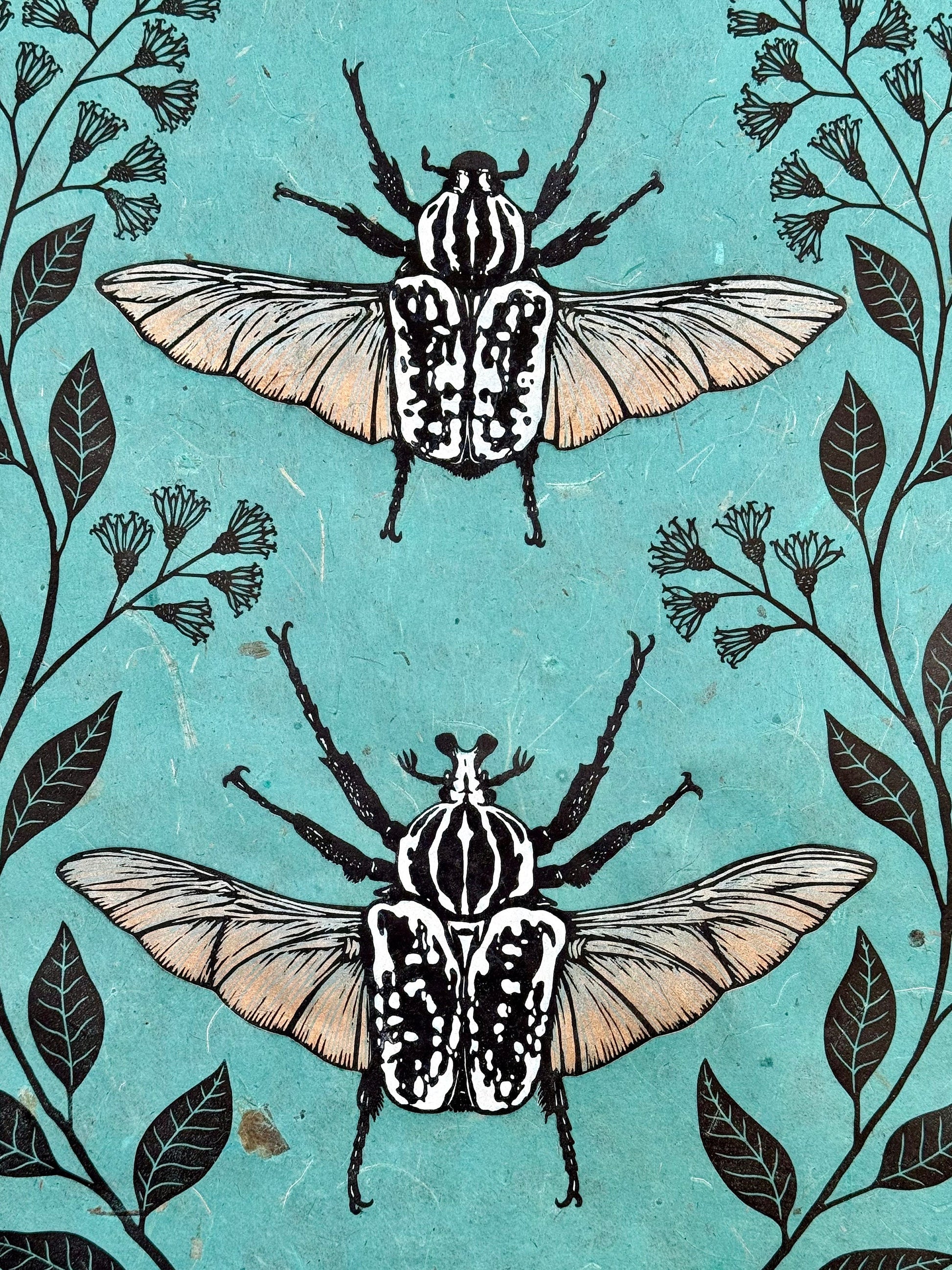 This is a handmade linocut print of a pair of Goliath beetles. Printed on 40gsm acid free Thai Mulberry paper (turquoise colour) with oil-based ink. The wings are printed with a metallic ink giving them a gorgeous shine. This paper is thin but very strong. Signed on the front and numbered. This is a limited edition of just 12 prints. Please note this print is unmounted and unframed.
