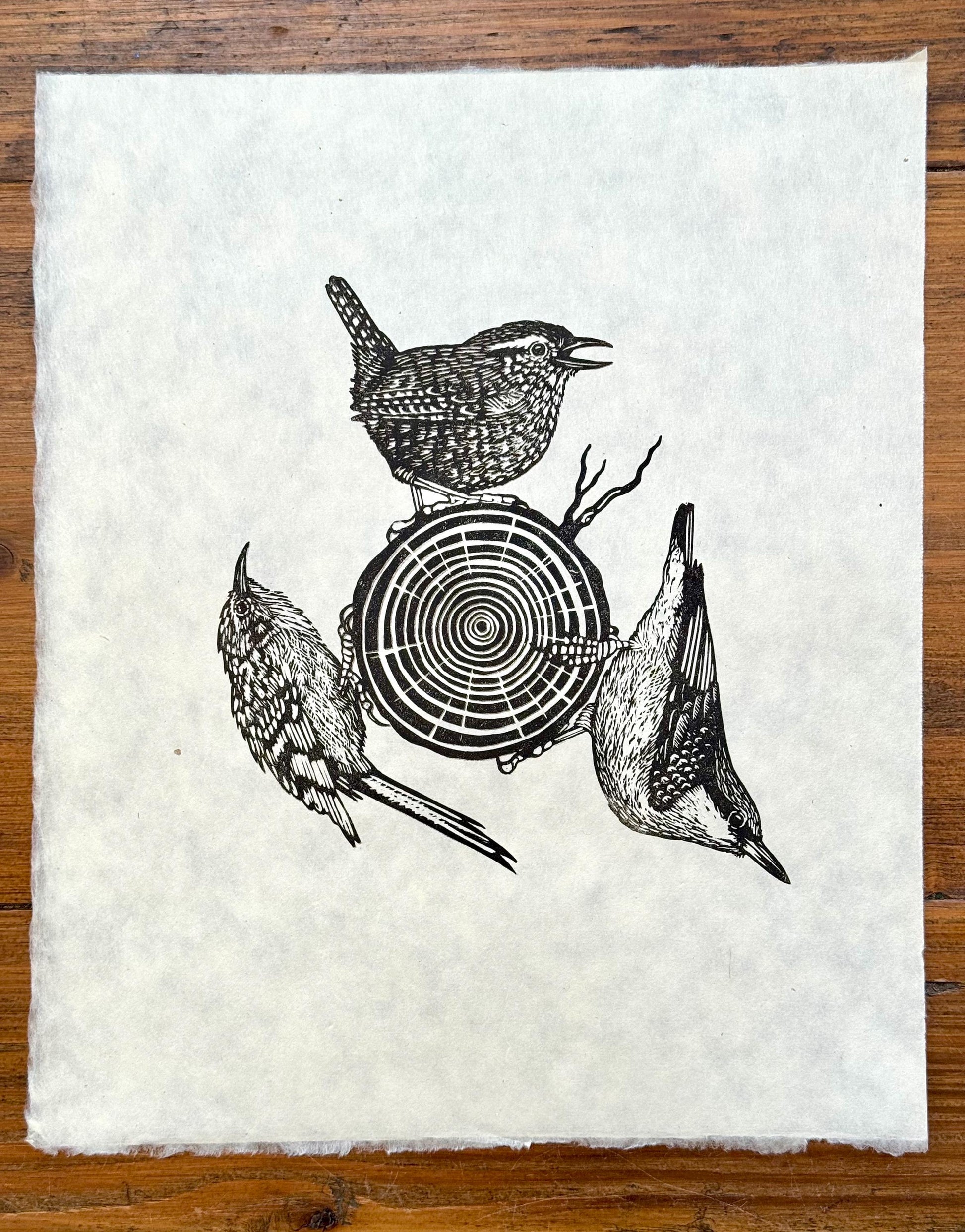 Inner Circle is a handmade linocut print of three members of the superfamily ‘Certhioidea’ belonging to the infraorder Passerida containing wrens, treecreepers, and nuthatches. I have had the joy of seeing all of these birds locally and have used my own photographs as reference.