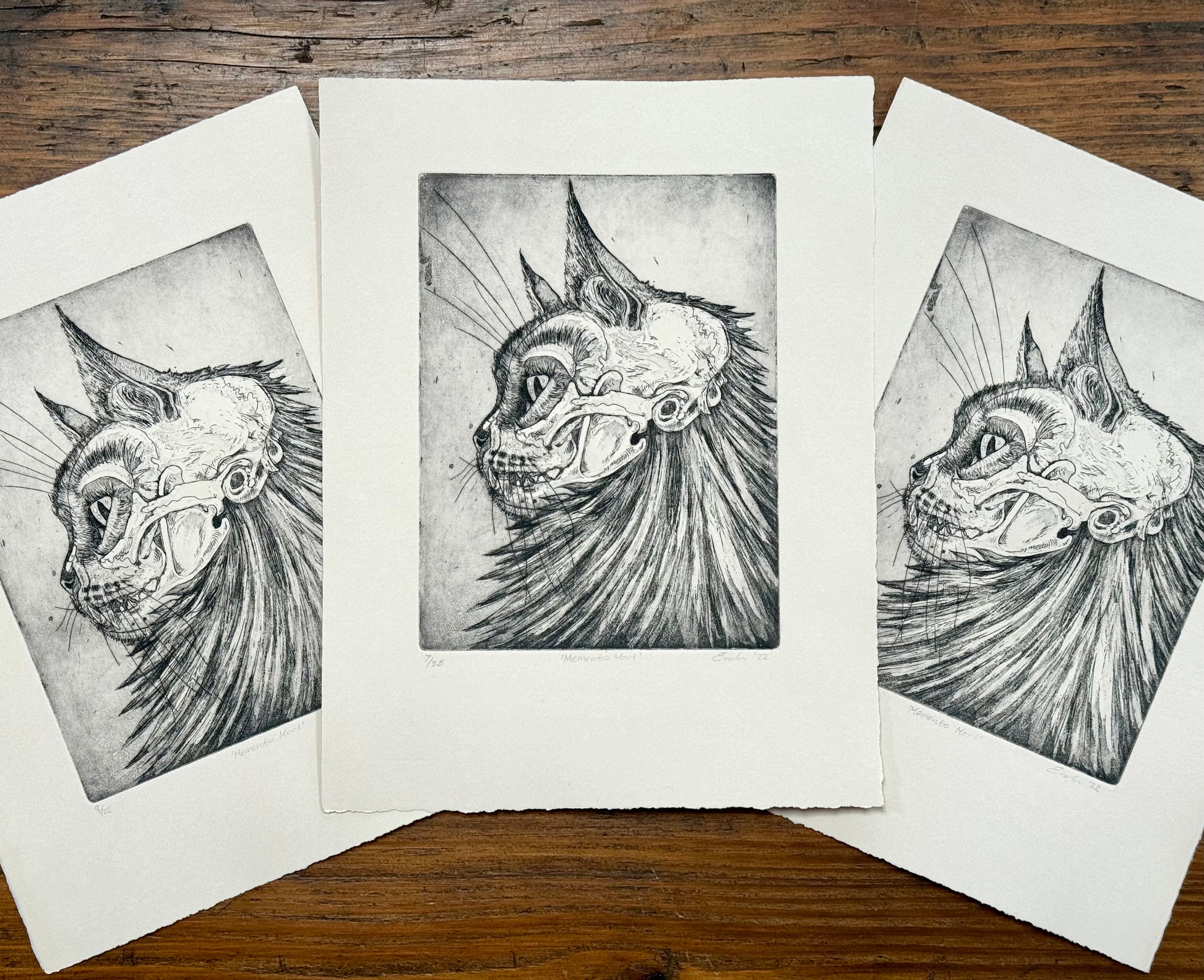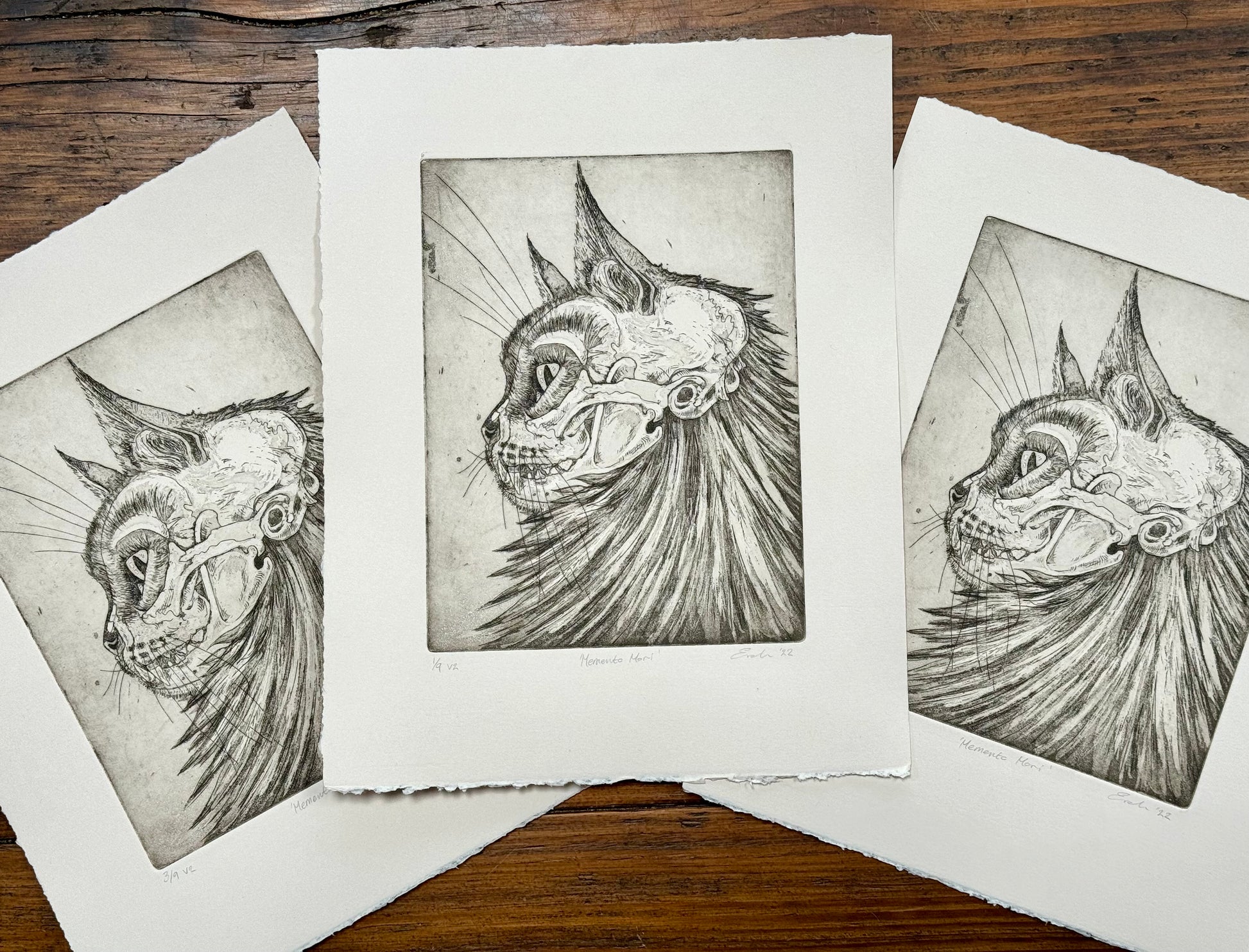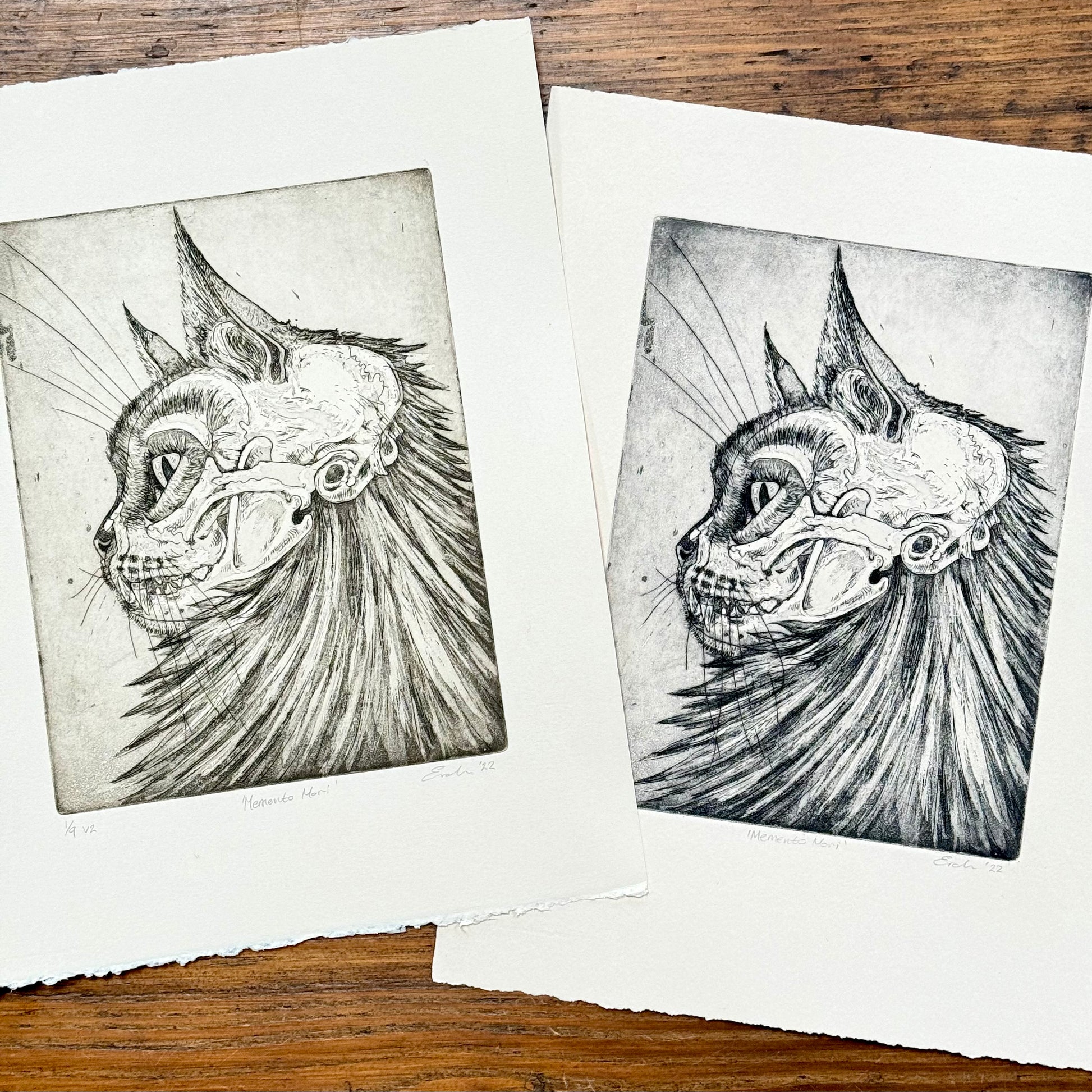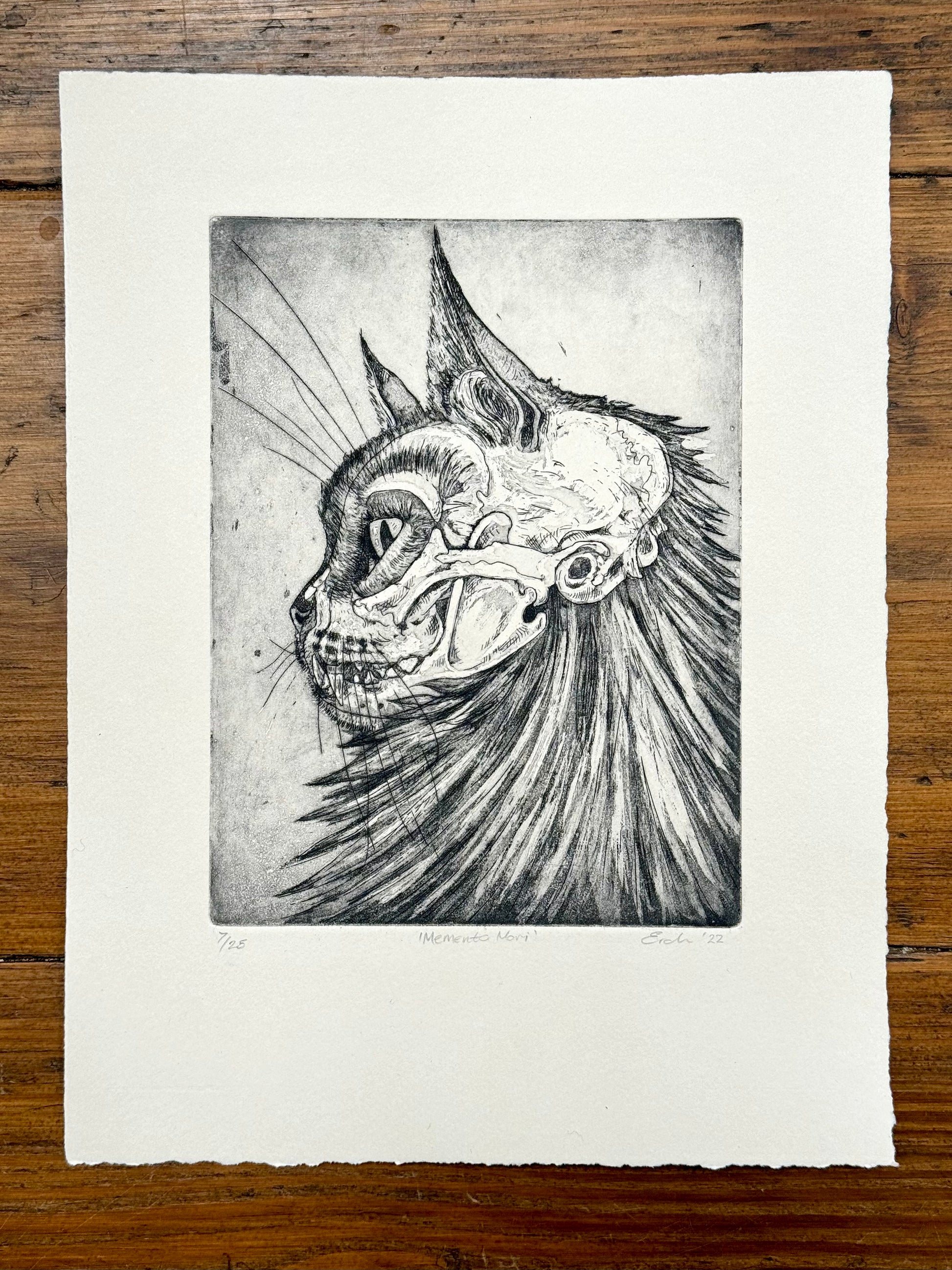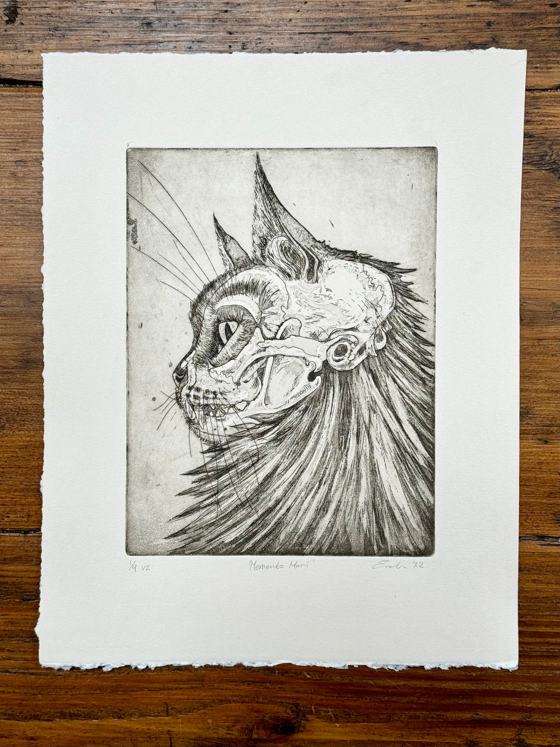 'Memento Mori' is a limited edition aquatint etching. Printed onto Fabriano Rosaspina 285gsm acid free paper, with Cranfield Caligo safe wash oil-based ink. This is lovely off white/subtle cream paper. There are two versions of this print available. the main edition is printed in dark brown (almost black) and is a limited edition of 25 prints. There is also a smaller edition of 9 prints in a lighter sepia brown. Signed and numbered on the front.