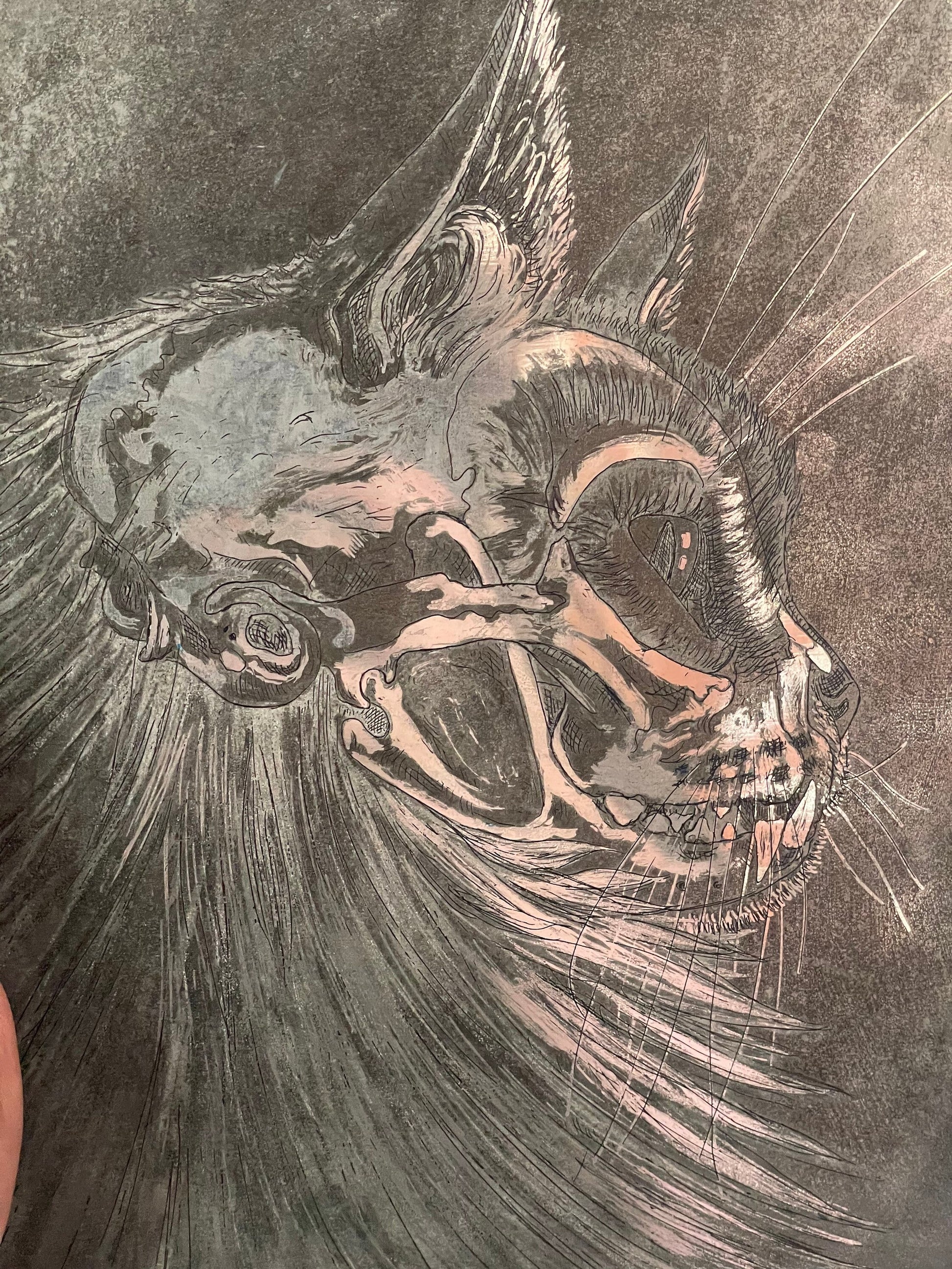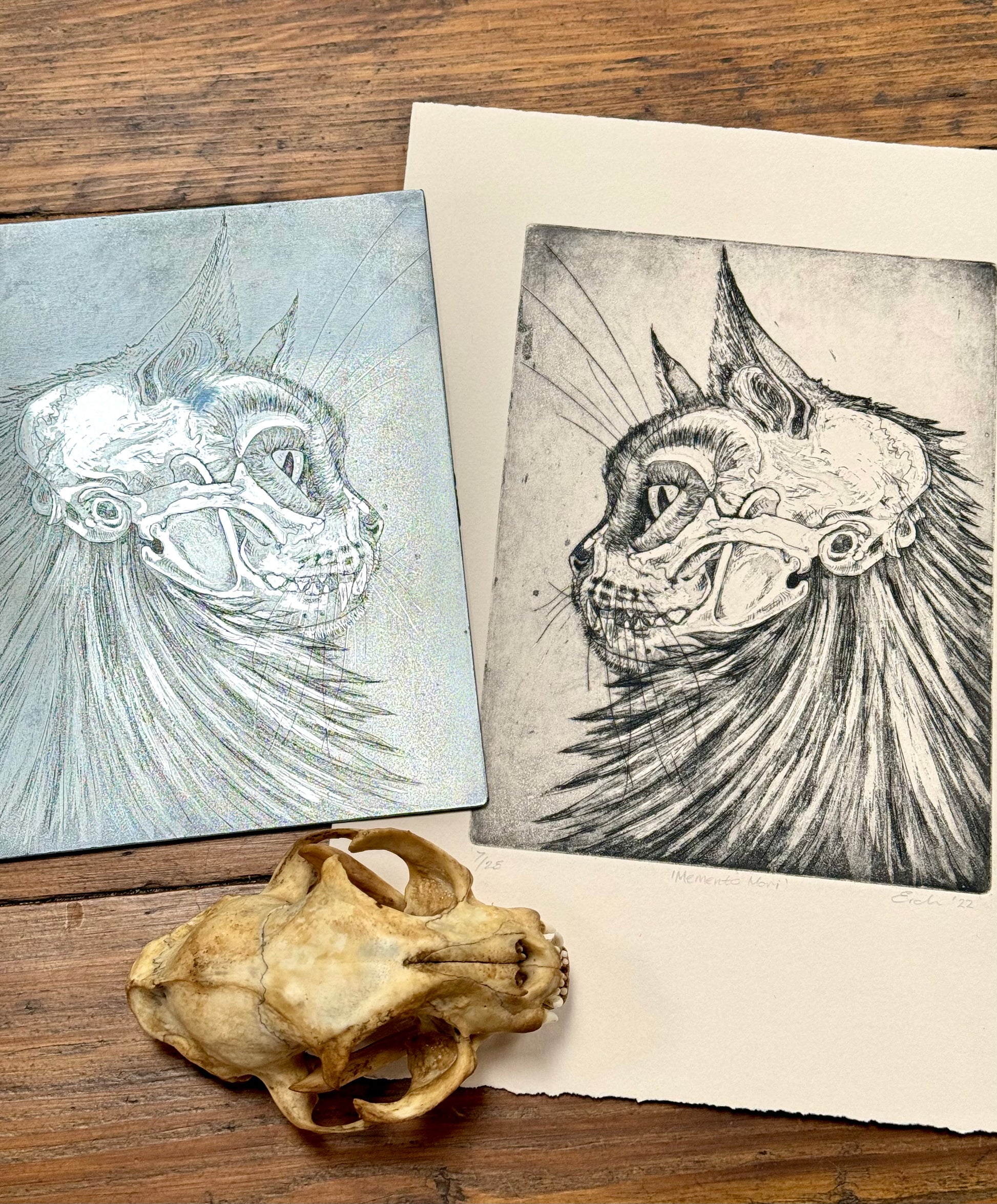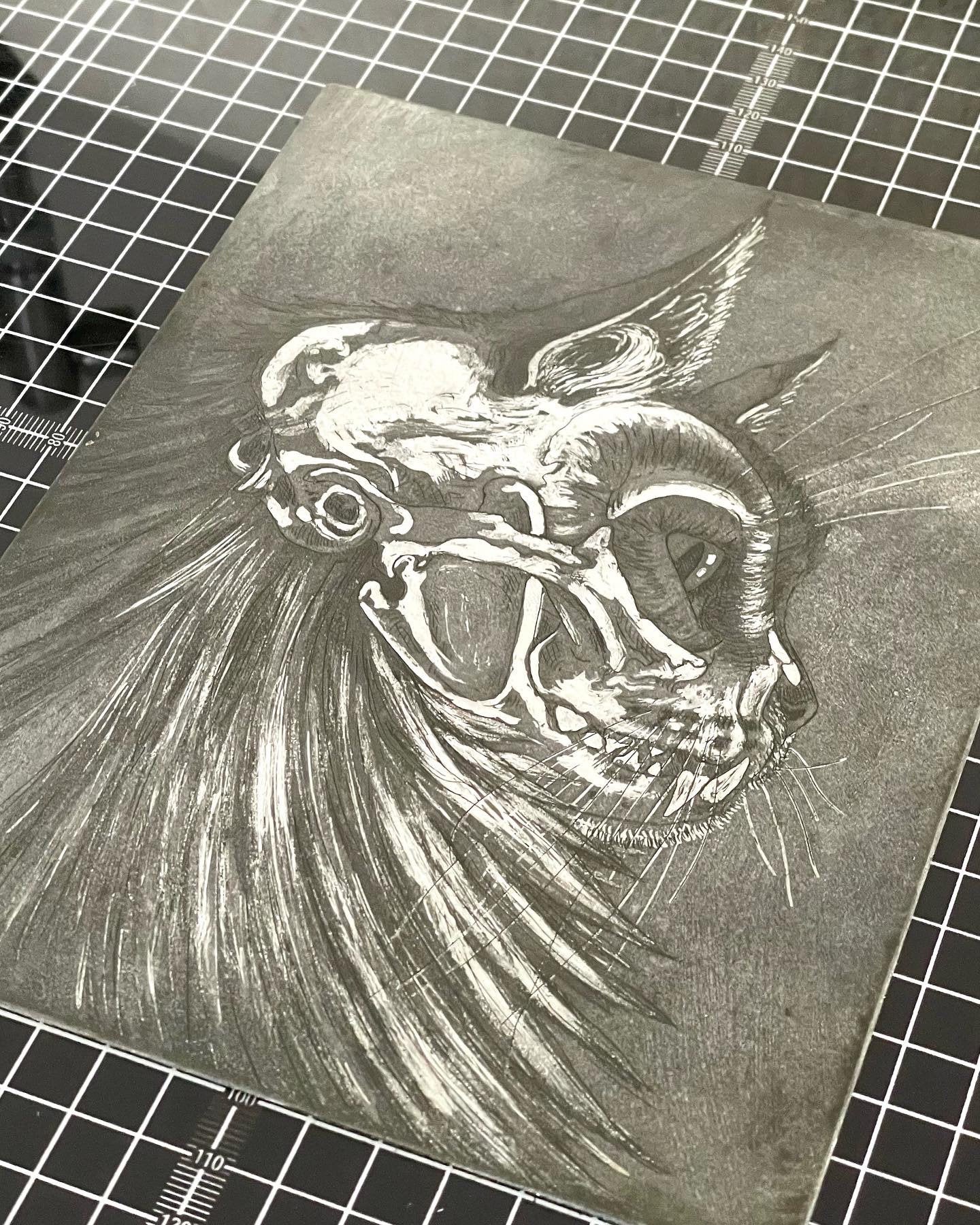 Cat skull aquatint etching