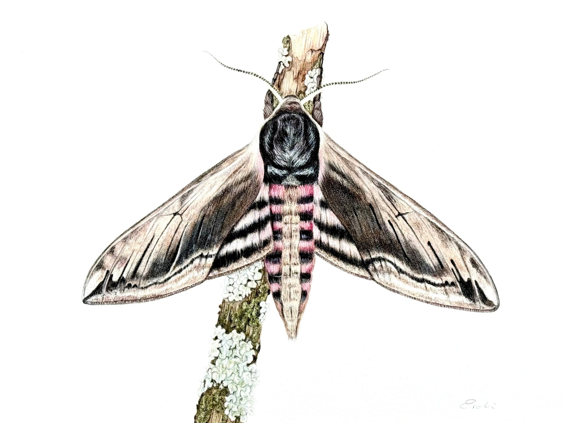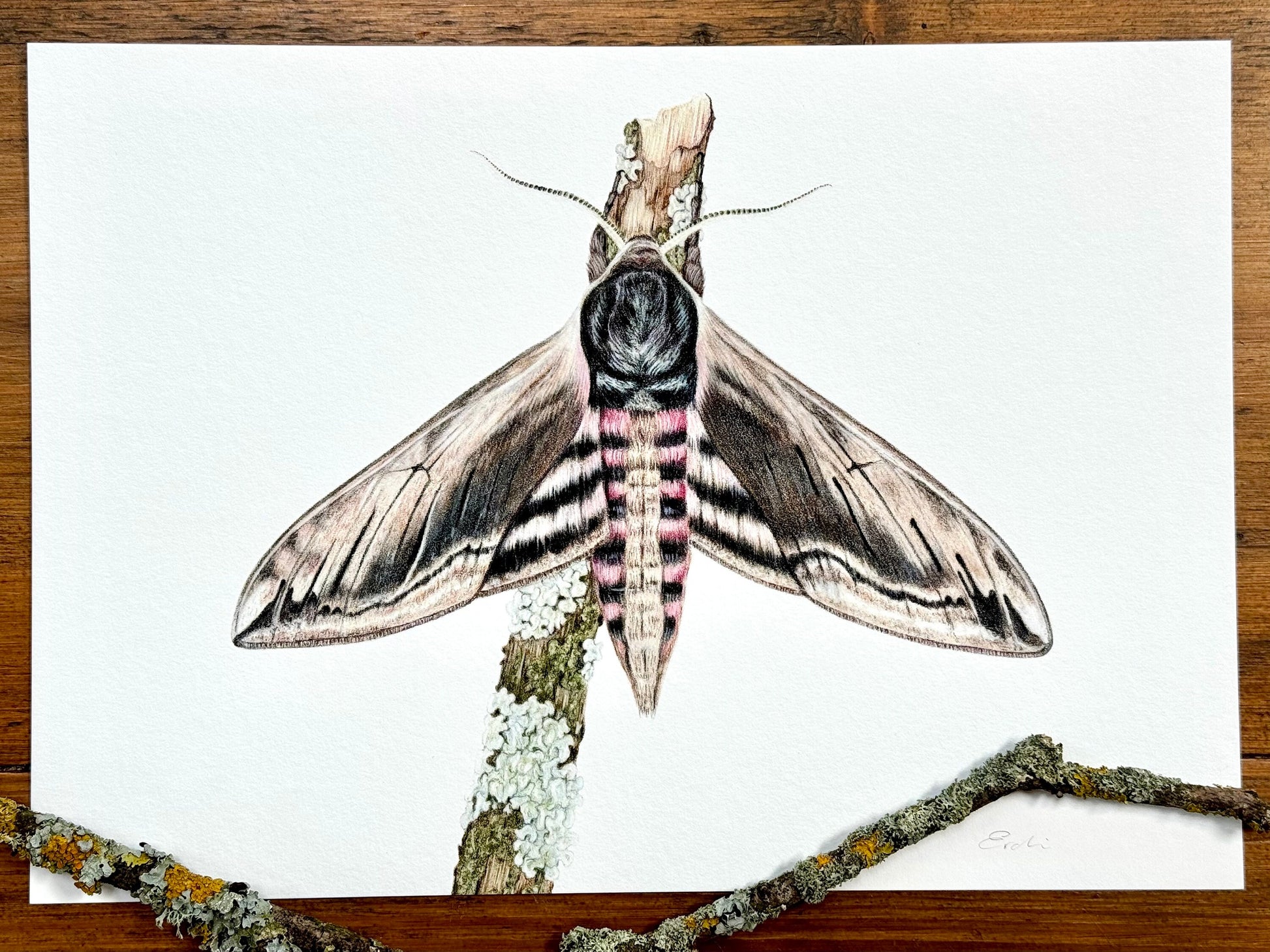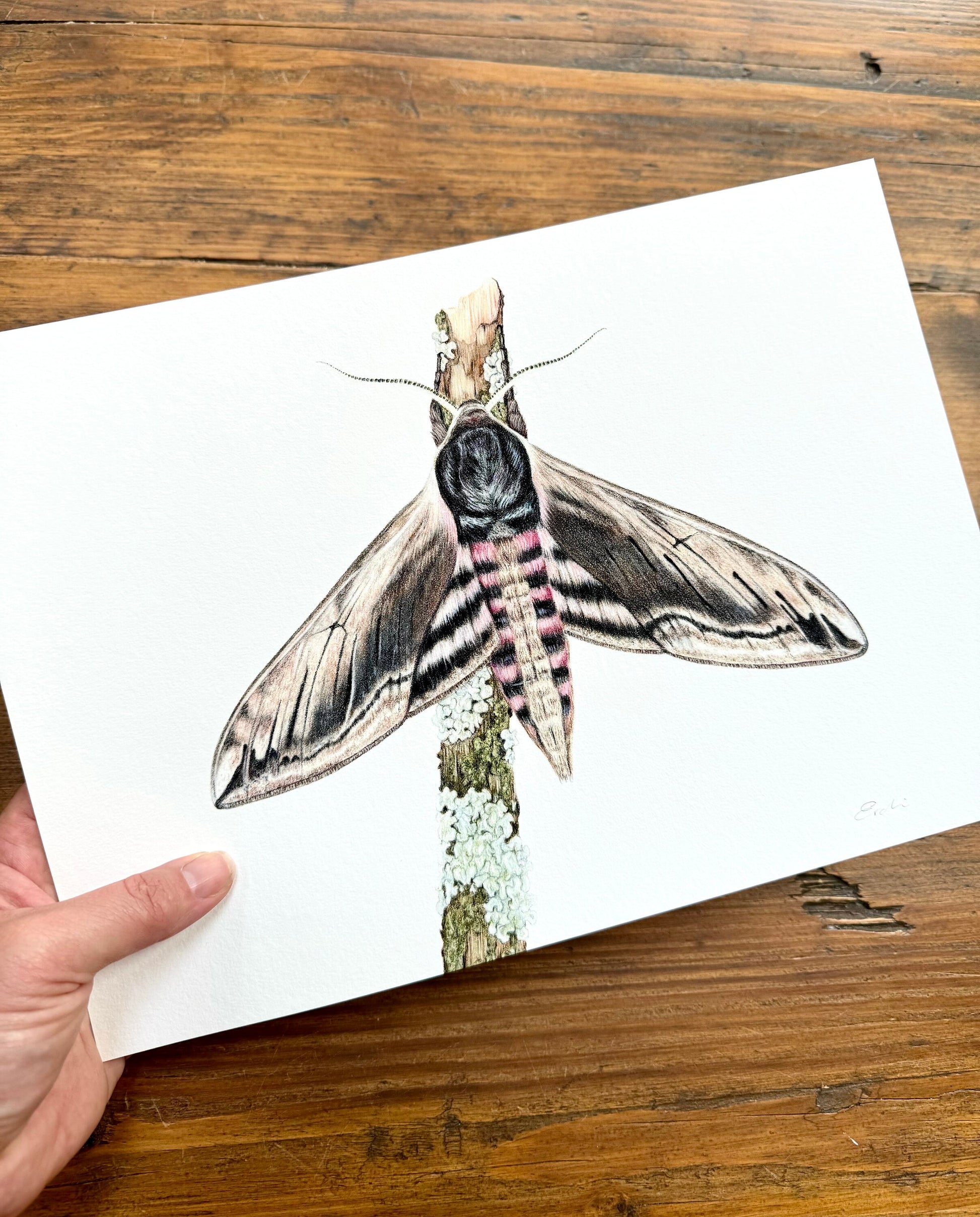 High quality Giclée reproduction (archival digital print) of a privet hawk moth drawing. The original drawing was created in coloured pencil on pastelmat paper. This is a print of the original artwork which has been created to the highest standards, printed on Hahnemühle 350 gsm museum etching paper - 100% Rag Paper with a subtle surface texture. Signed on the front. Please note this is print is unmounted and unframed.