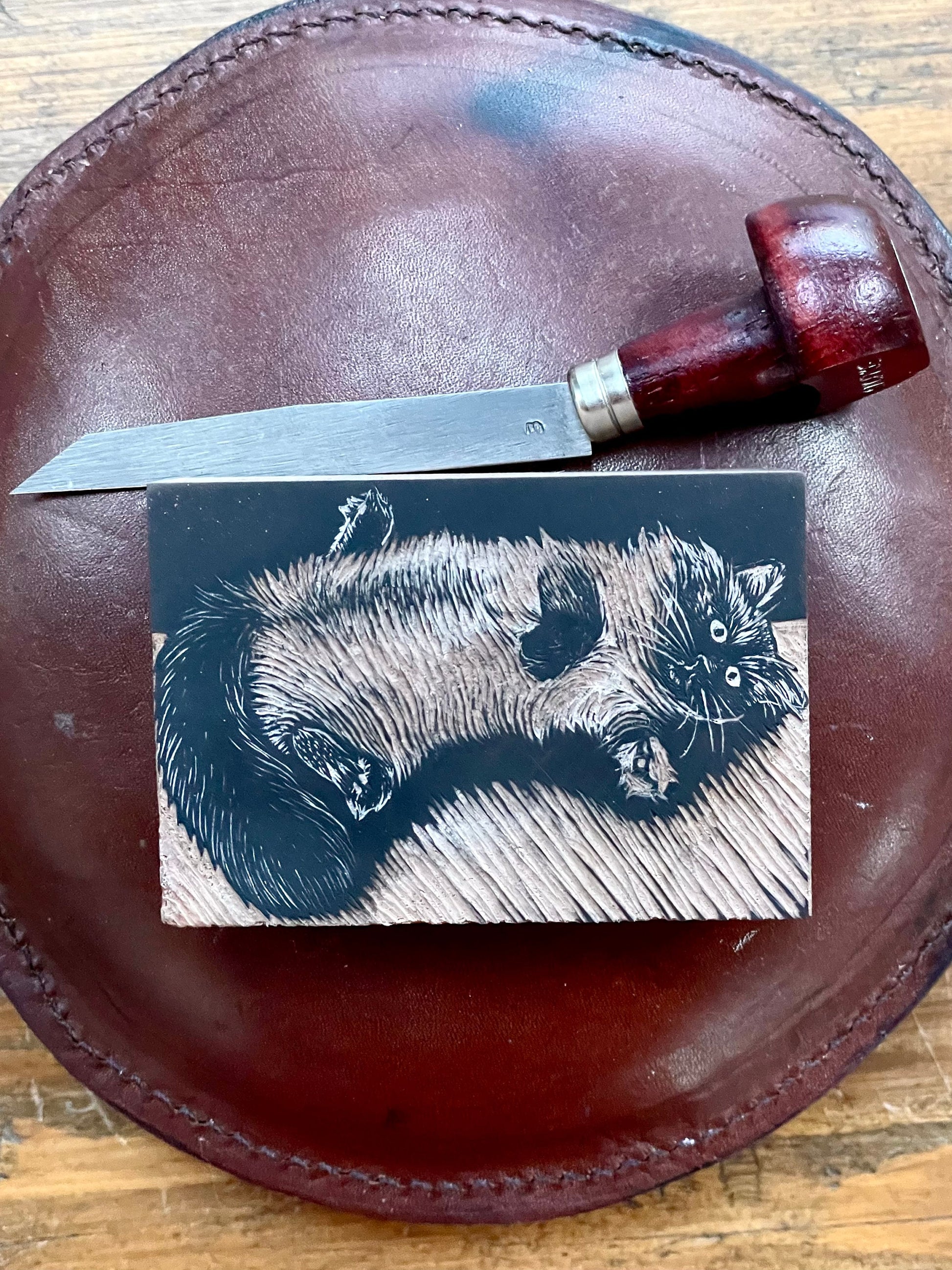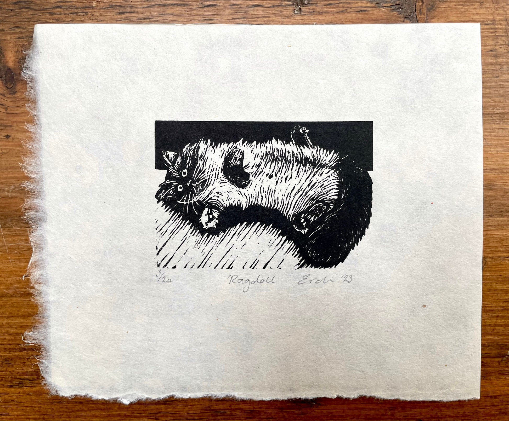 An original wood engraving of Cleo, our very floofy Ragdoll cat! Engraved into a block of Pearwood.