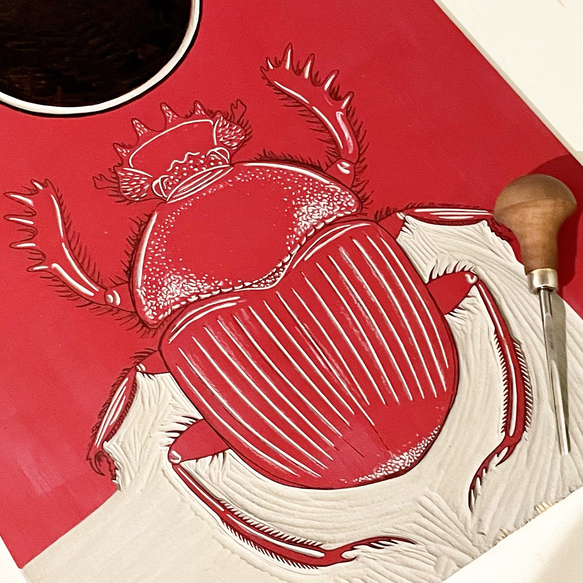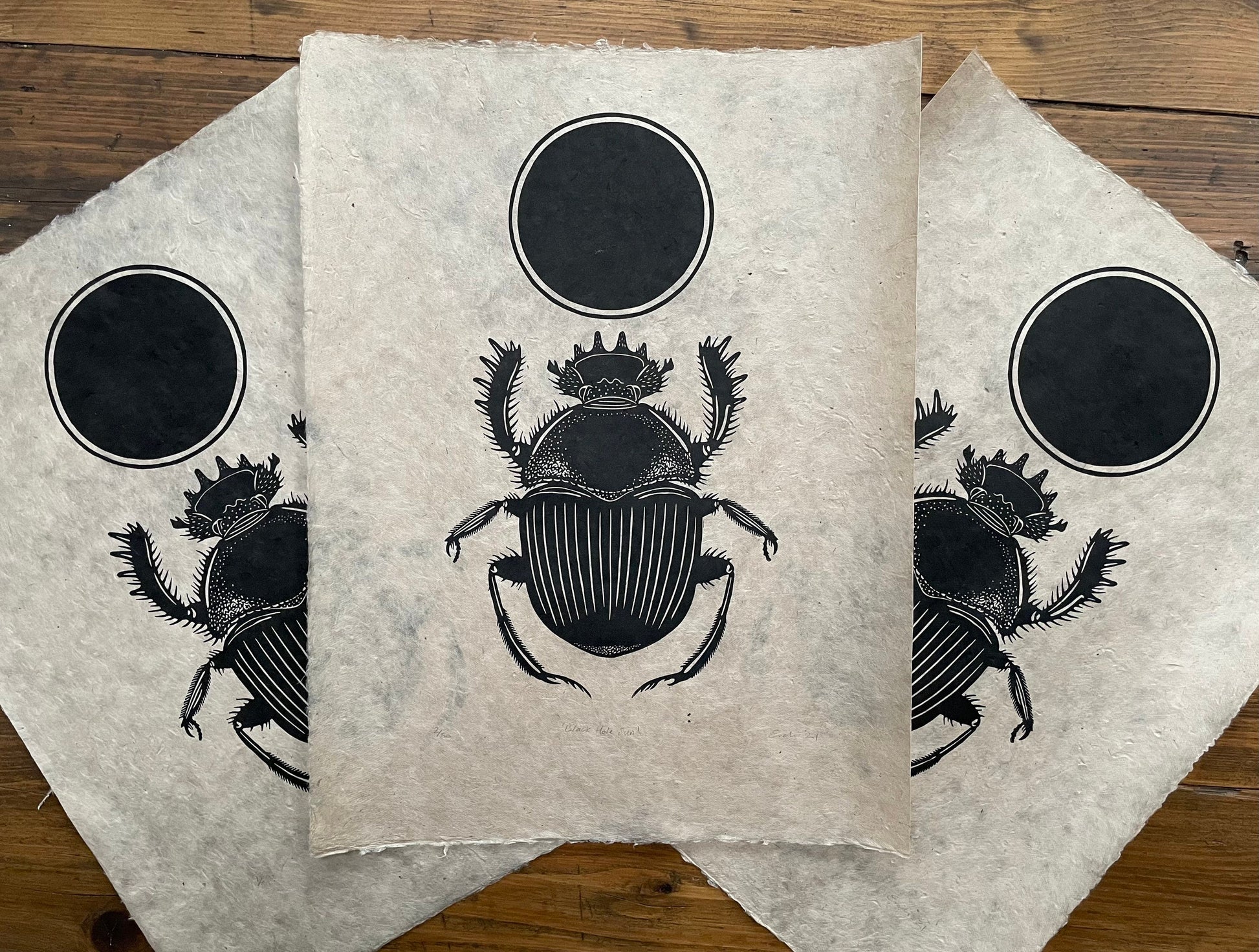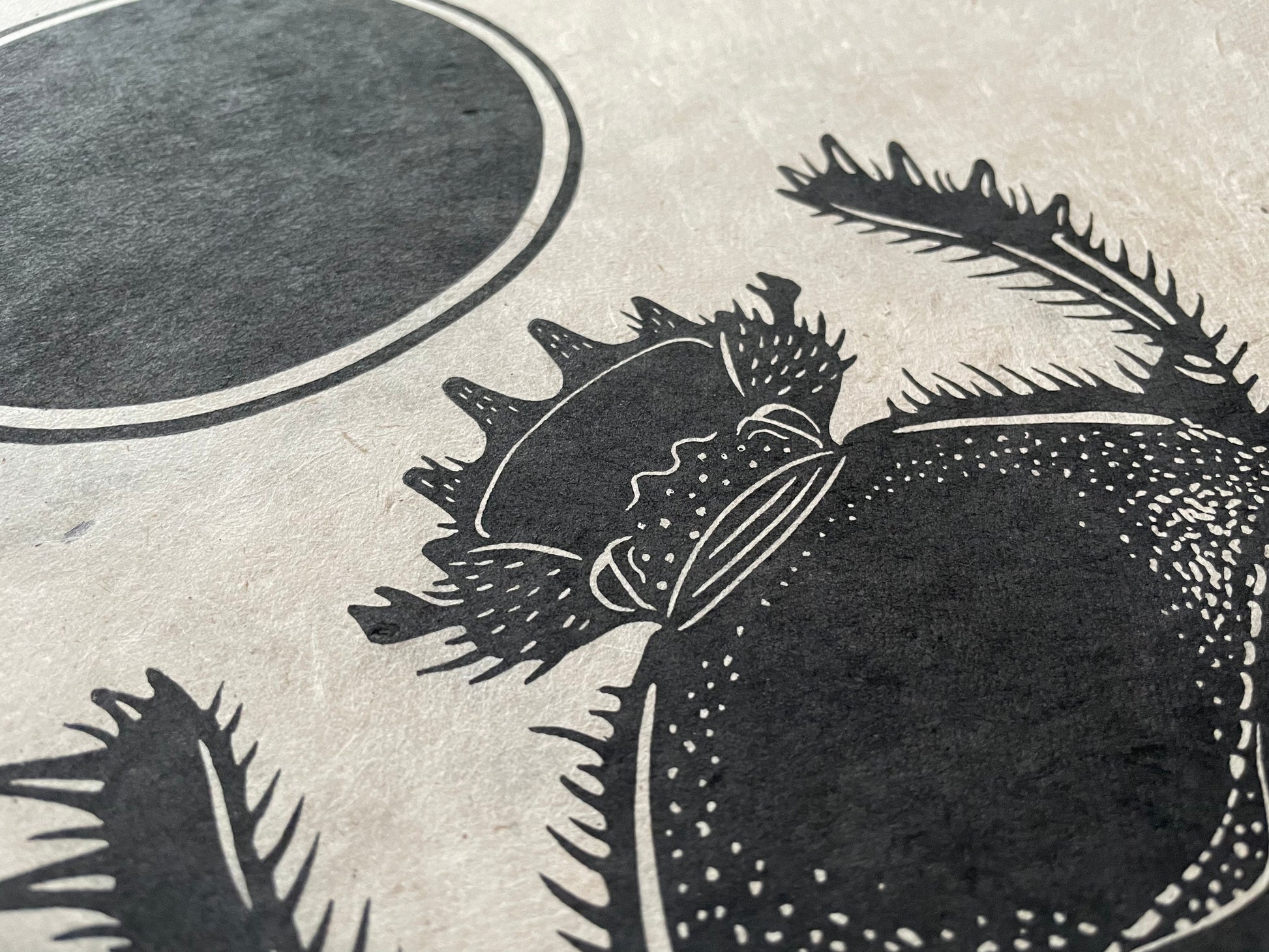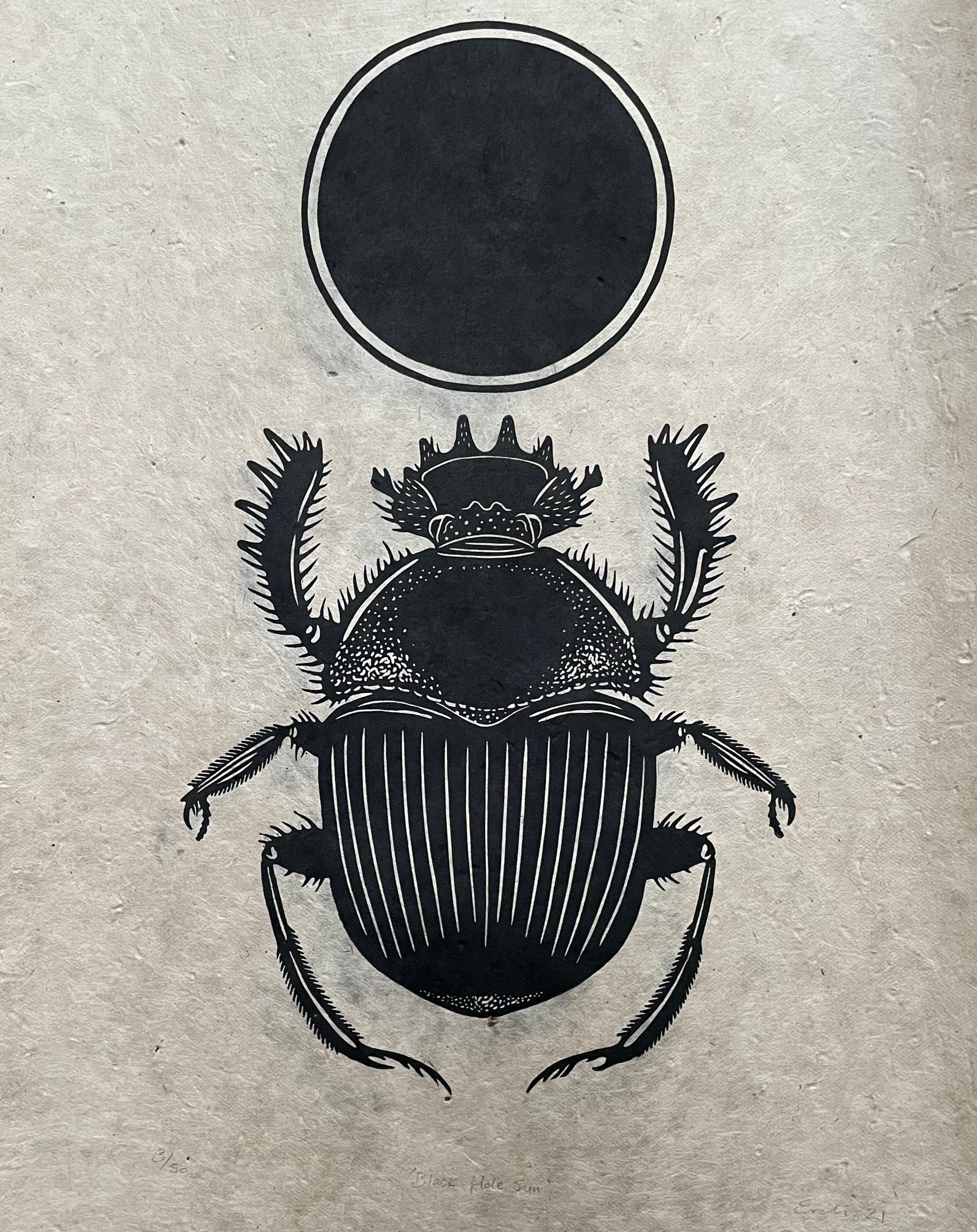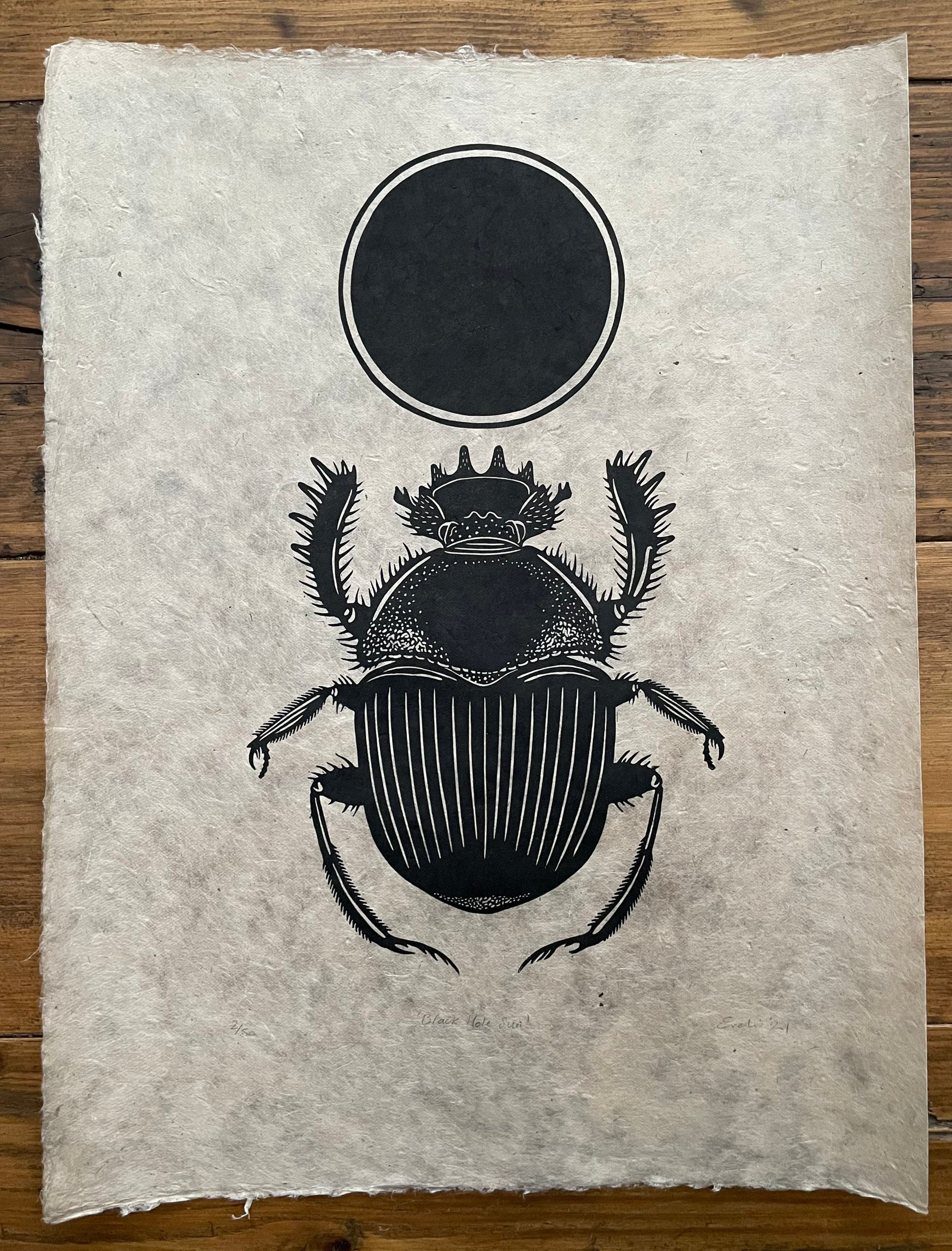 ‘Black Hole Sun’ is a hand pulled linocut print of a scarab beetle. Printed on 90gsm acid free Lokta paper with Cranfield Caligo safe wash oil-based ink. This paper is handmade and has a lovel texture. Signed on the front. Please note this print is unmounted and unframed.