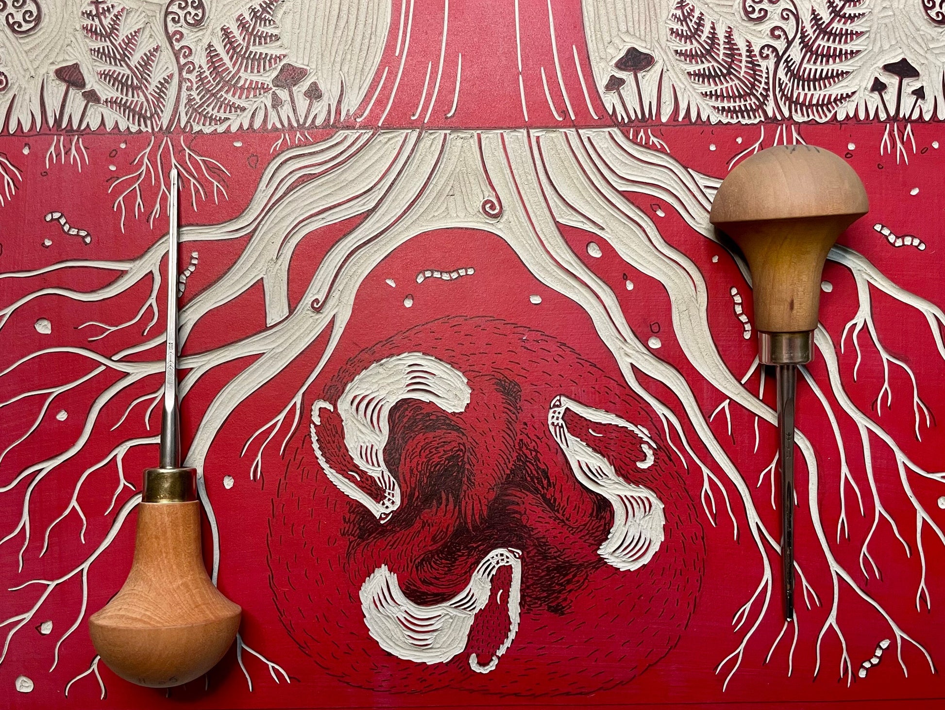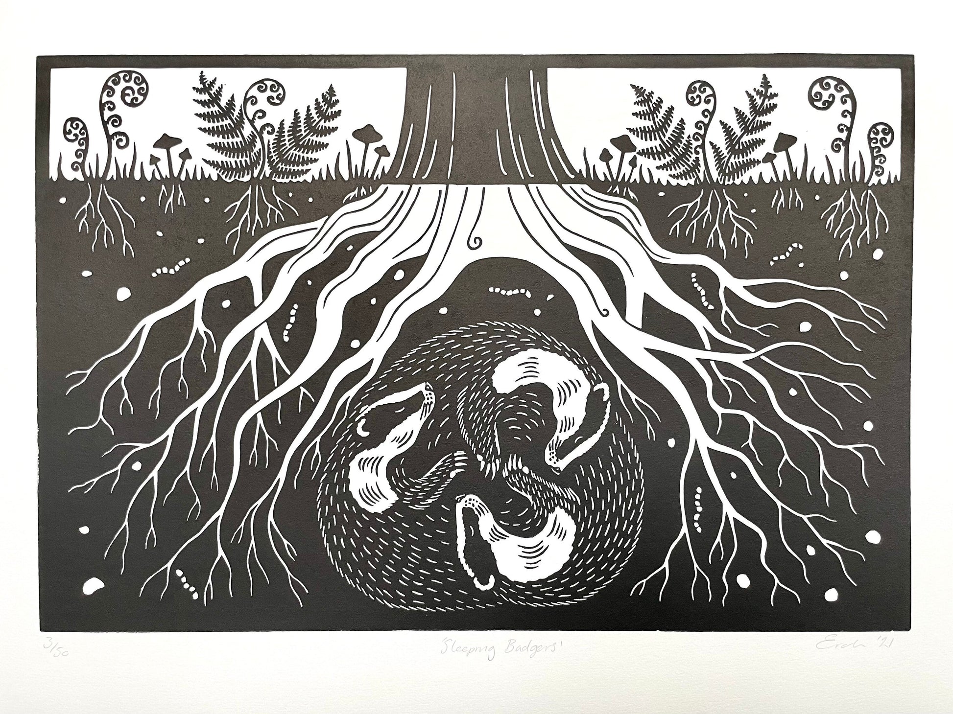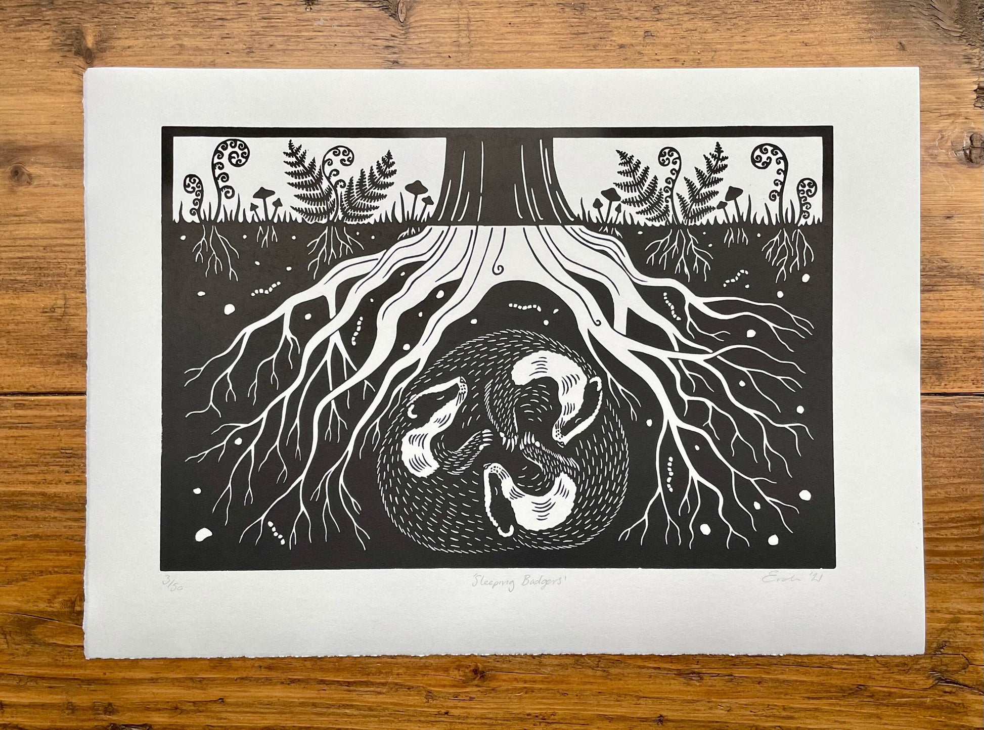 This is a hand made lino print of a trinity of badgers sleeping amongst the roots of a tree. Printed onto acid free 145gsm Zerkall paper (with two deckled edges), with Cranfield Caligo safe wash oil-based ink. Signed and numbered on the front. This is a limited edition of 50 prints. Please note this print is unmounted and unframed.