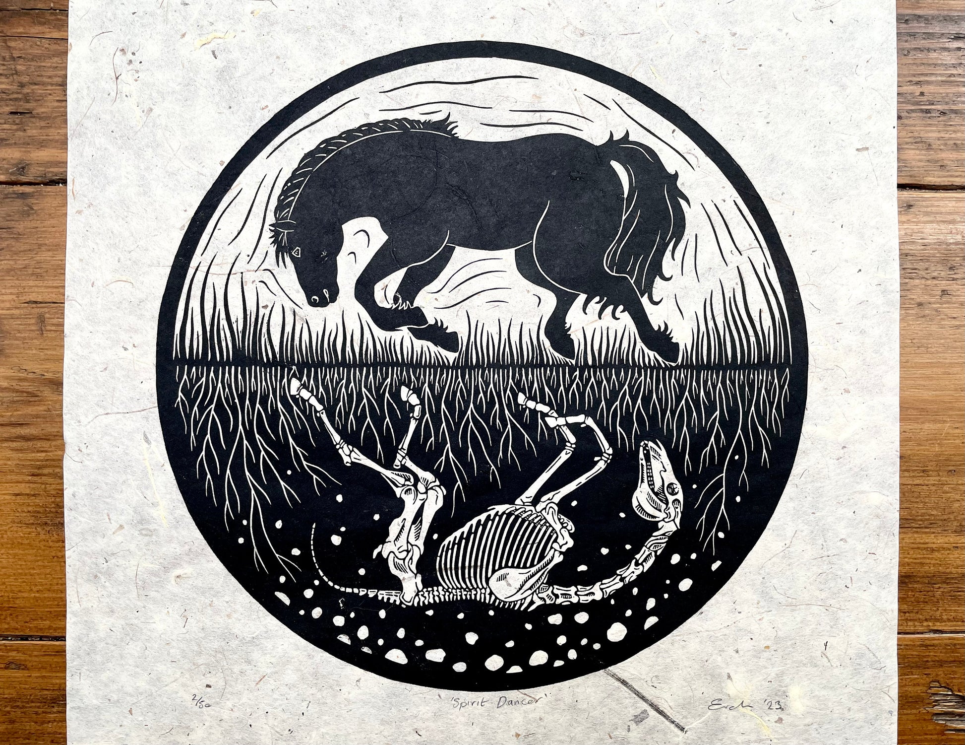 'Spirit Dancer' is a hand printed lino cut of a black horse/horse skeleton. Part of a series of prints exploring the cycle of the life and death in animals.