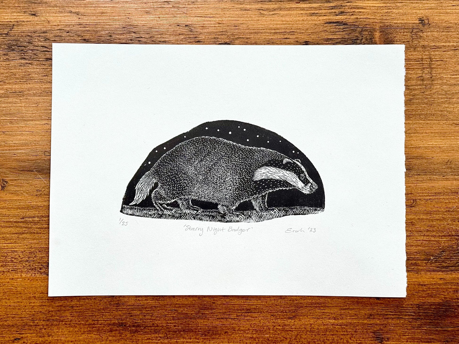 An original wood engraving of a badger under a starry night sky, engraved into a block of boxwood.