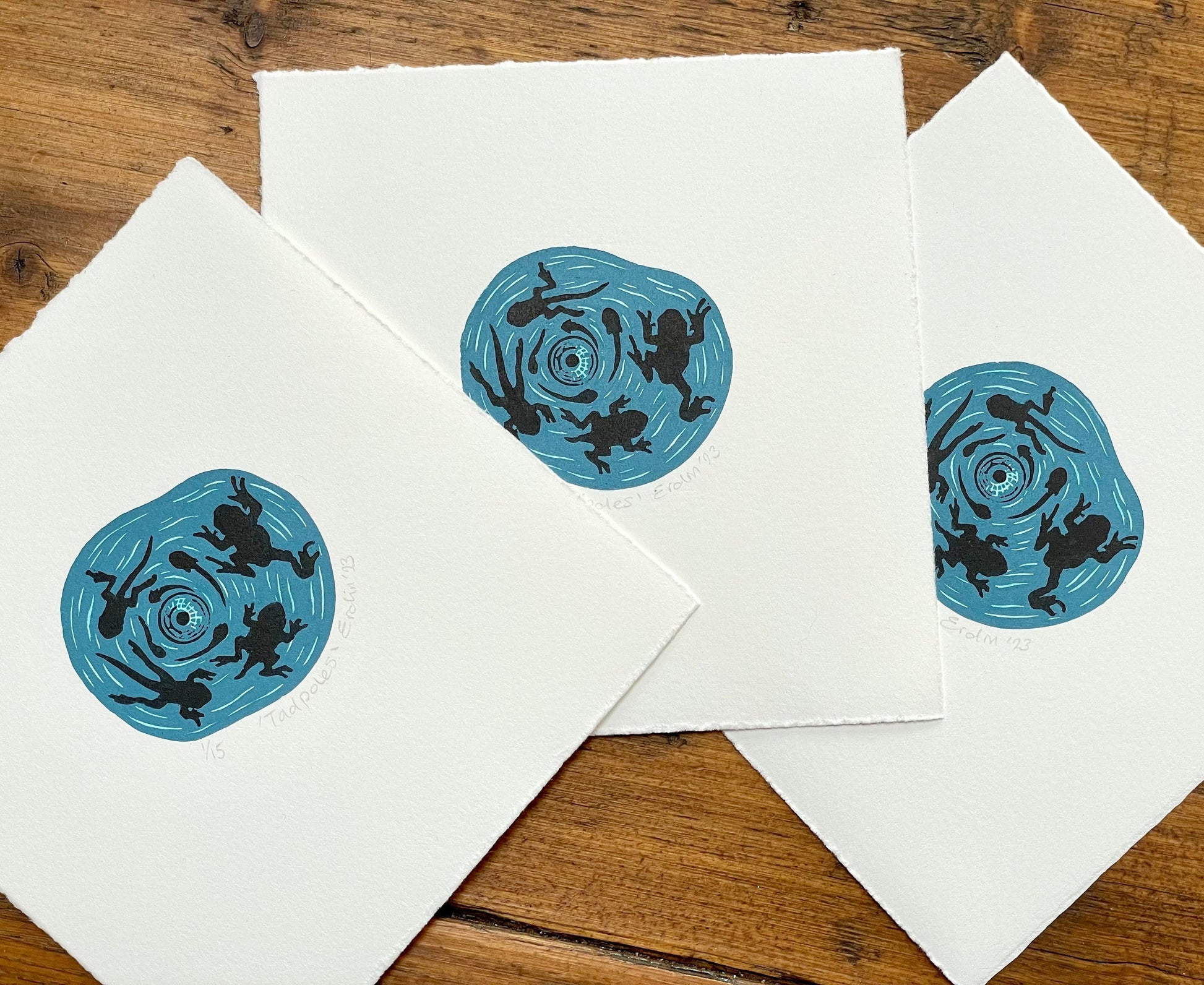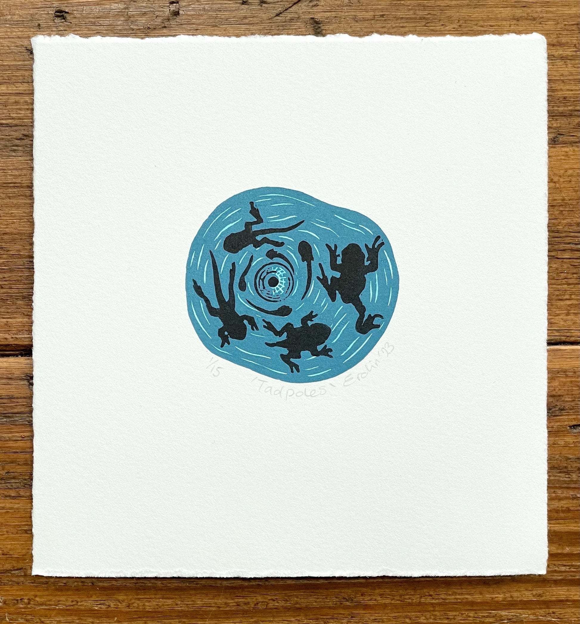 An original wood engraving of tadpole development. This print is made from two blocks of Lemonwood.