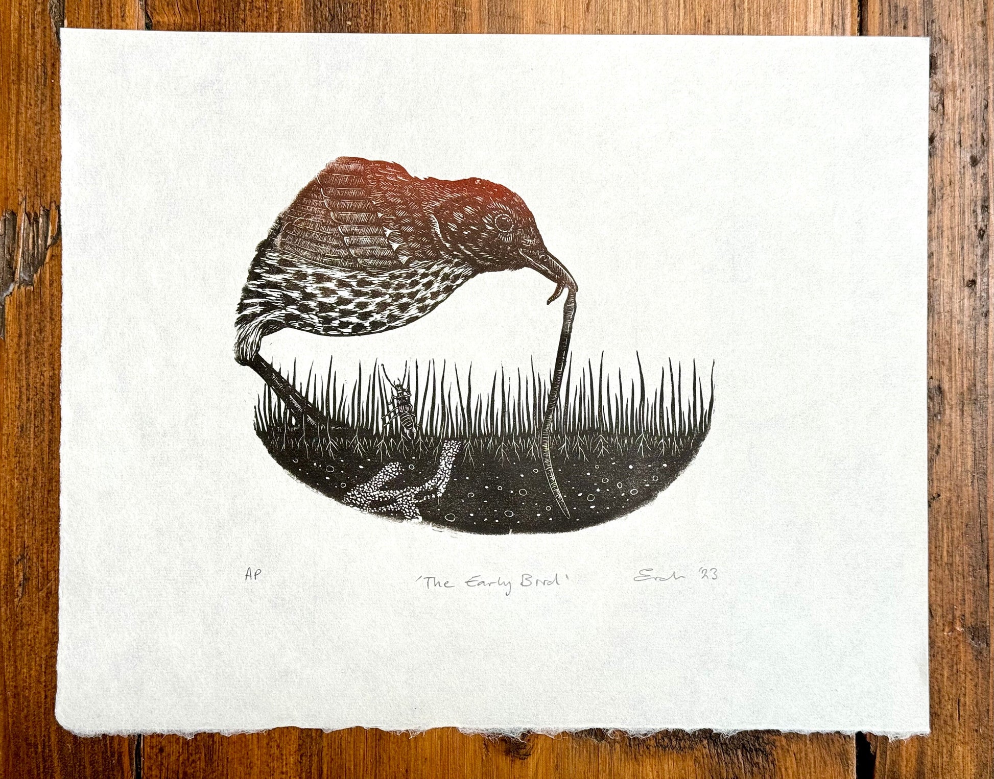 Printed on 51gsm Awagami Okawara Select paper (a lovely off white/subtle cream) with Cranfield Caligo safe wash oil-based ink. Signed on the front. This is an 'Artists's Proof' with only three copies being available. It was planned as an edition, but the two toned brown prooved too tricky to reproduce reliably. A future edition in a single dark brown may yet be produced.