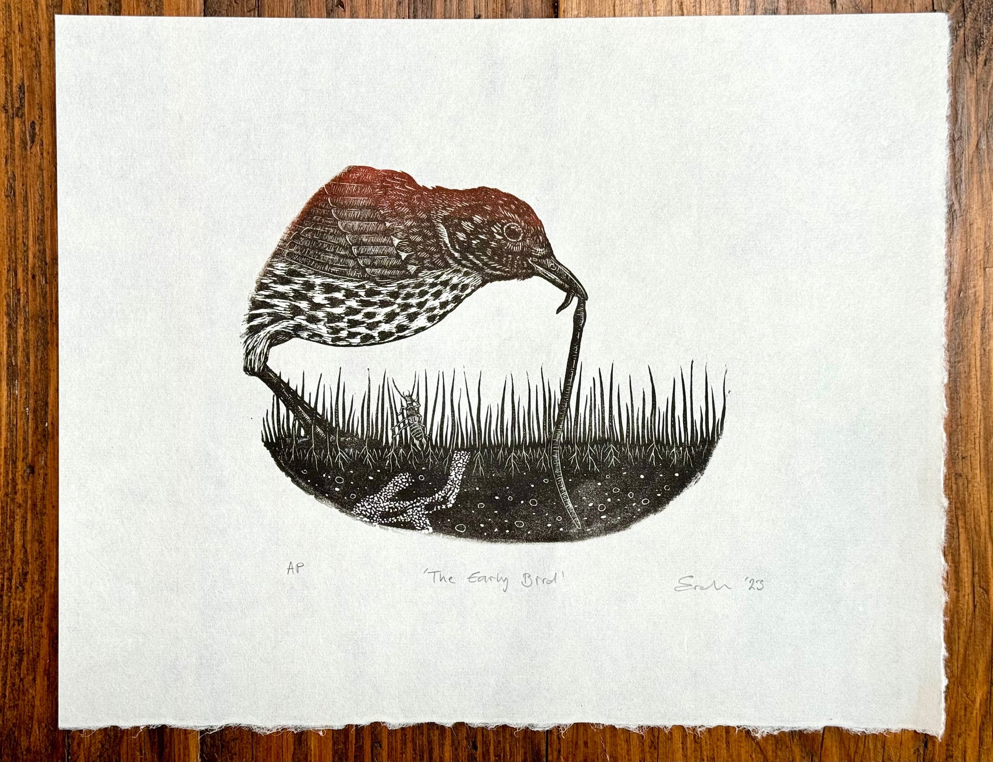 'The Early Bird' (wood engraving) features a thrush pulling up a worm for it's breakfast, while other mini beasts scuttle about and below the grass.