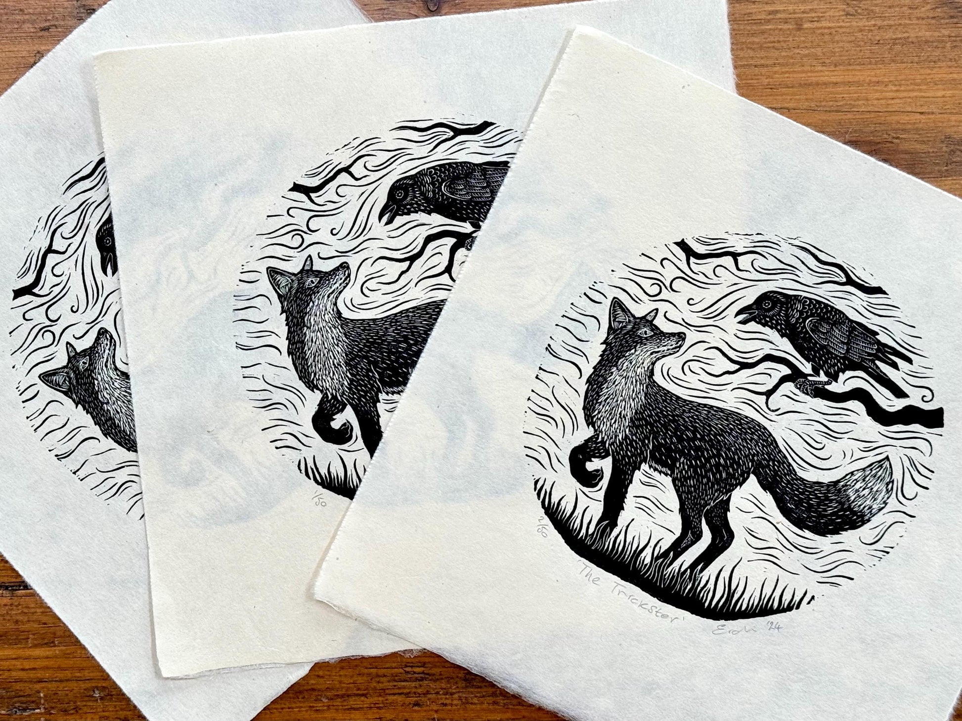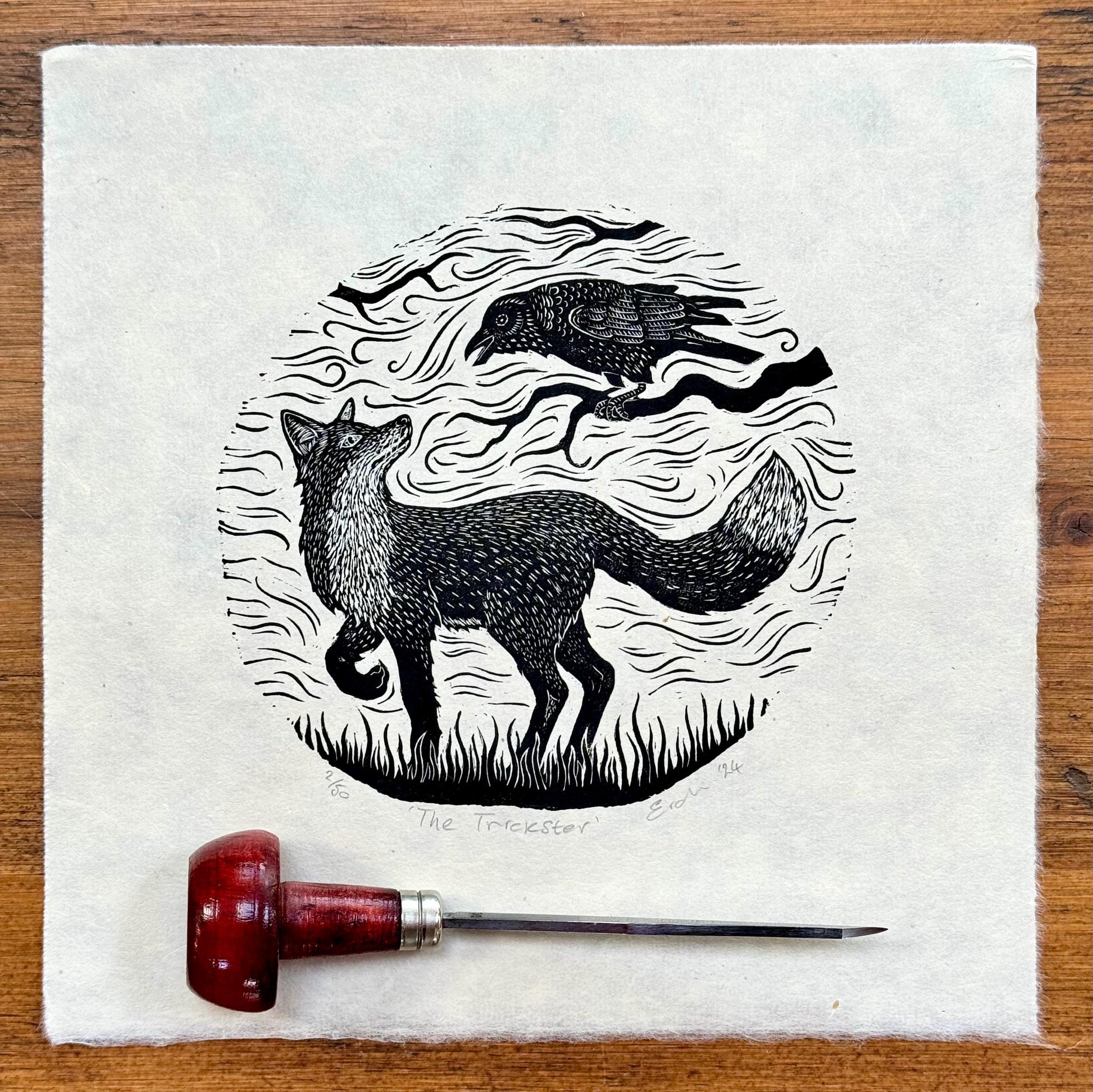 The Trickster is an original wood engraving based on Aesop’s fable ‘the fox and the crow'. Engraved into a round block of boxwood .