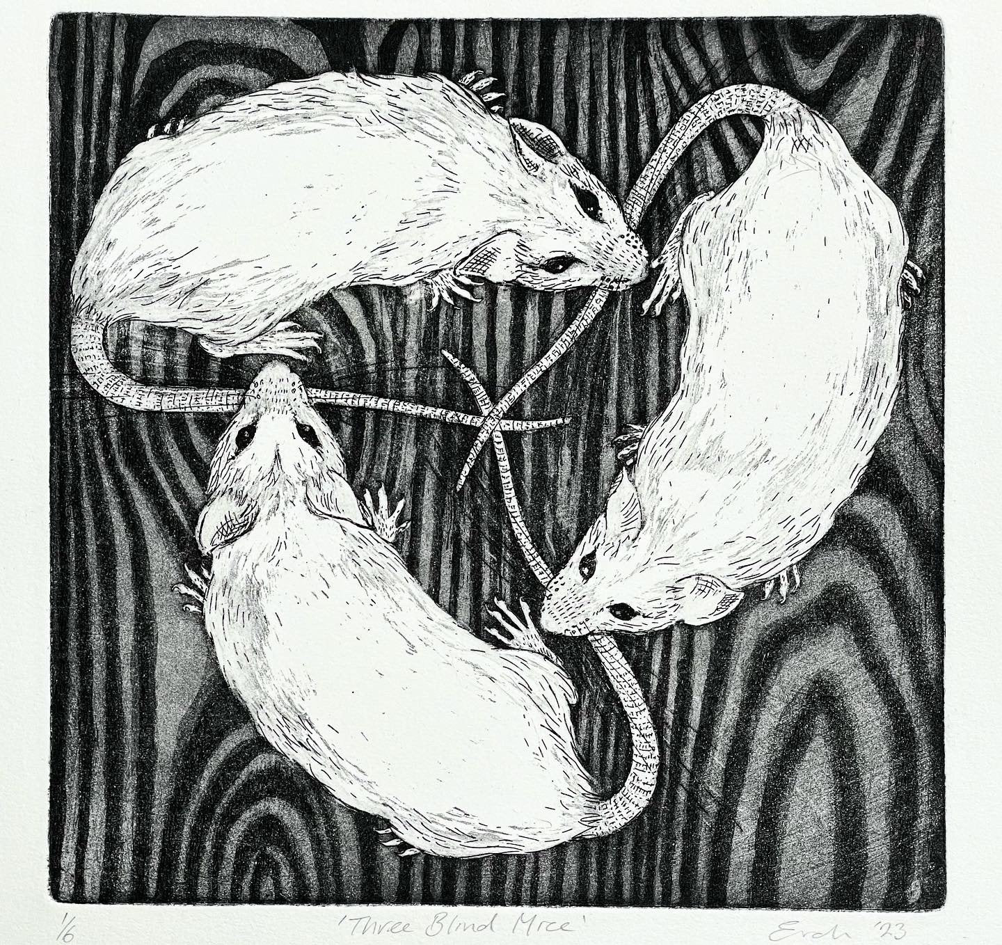 This is a limited edition aquatint etching three white mice, inspired by the nursery rhyme ’Three Blind Mice’. Printed onto Somerset 250gsm acid free paper, with Cranfield Caligo safe wash oil-based ink. Signed and numbered on the front. This is a limited edition of just six prints.