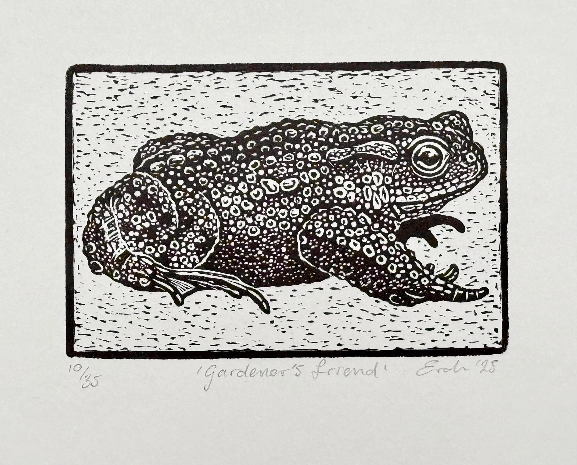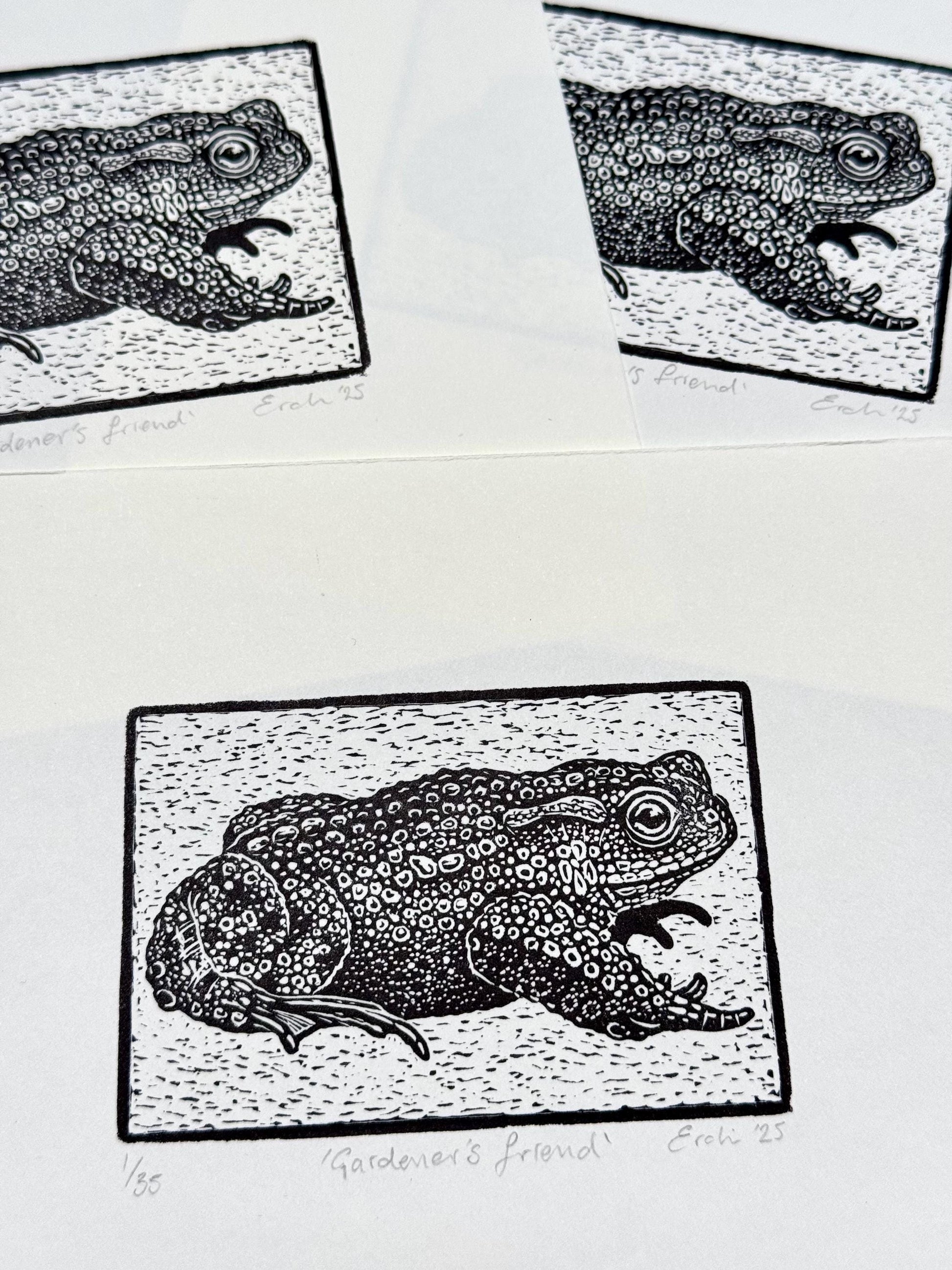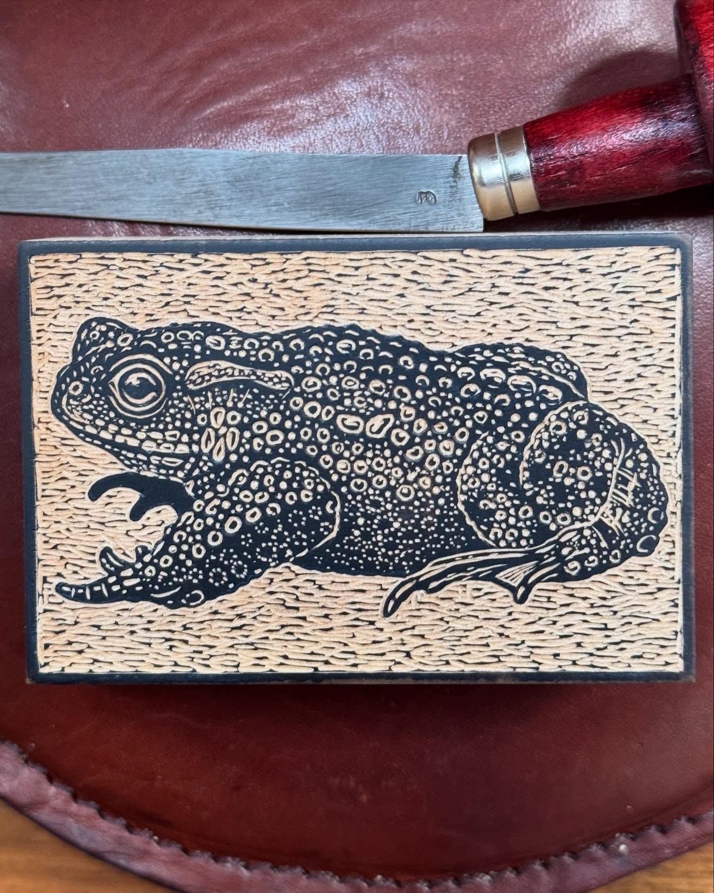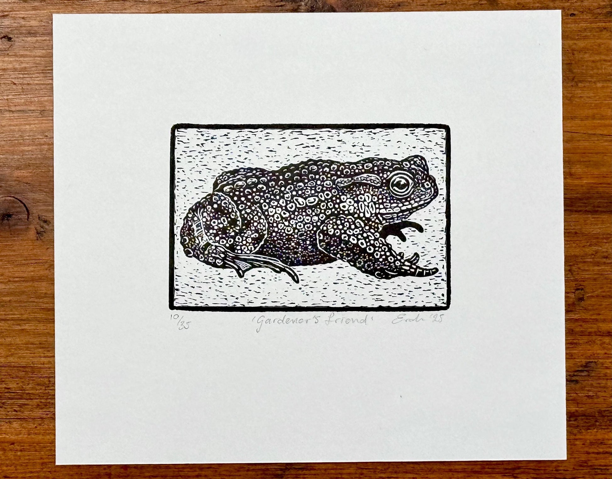 An original wood engraving of a toad, entitled 'Gardener's Friend'. Engraved into a block of Lemonwood.