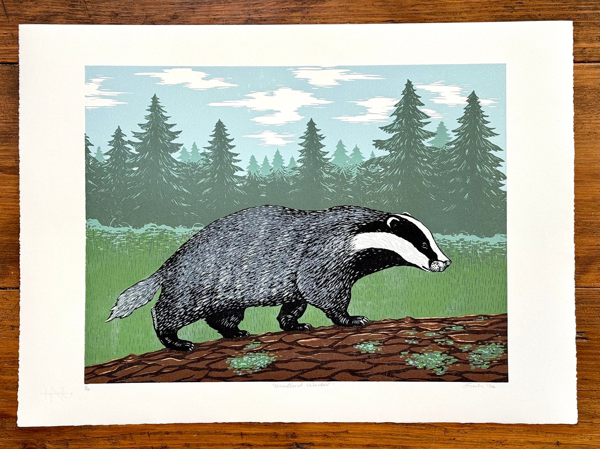 This is a handmade linocut print of a badger. Entitled 'Woodland Wander' it is a 'reduction' print consisting of nine layers of ink. Each layer of the print is cut away after it has been printed.
