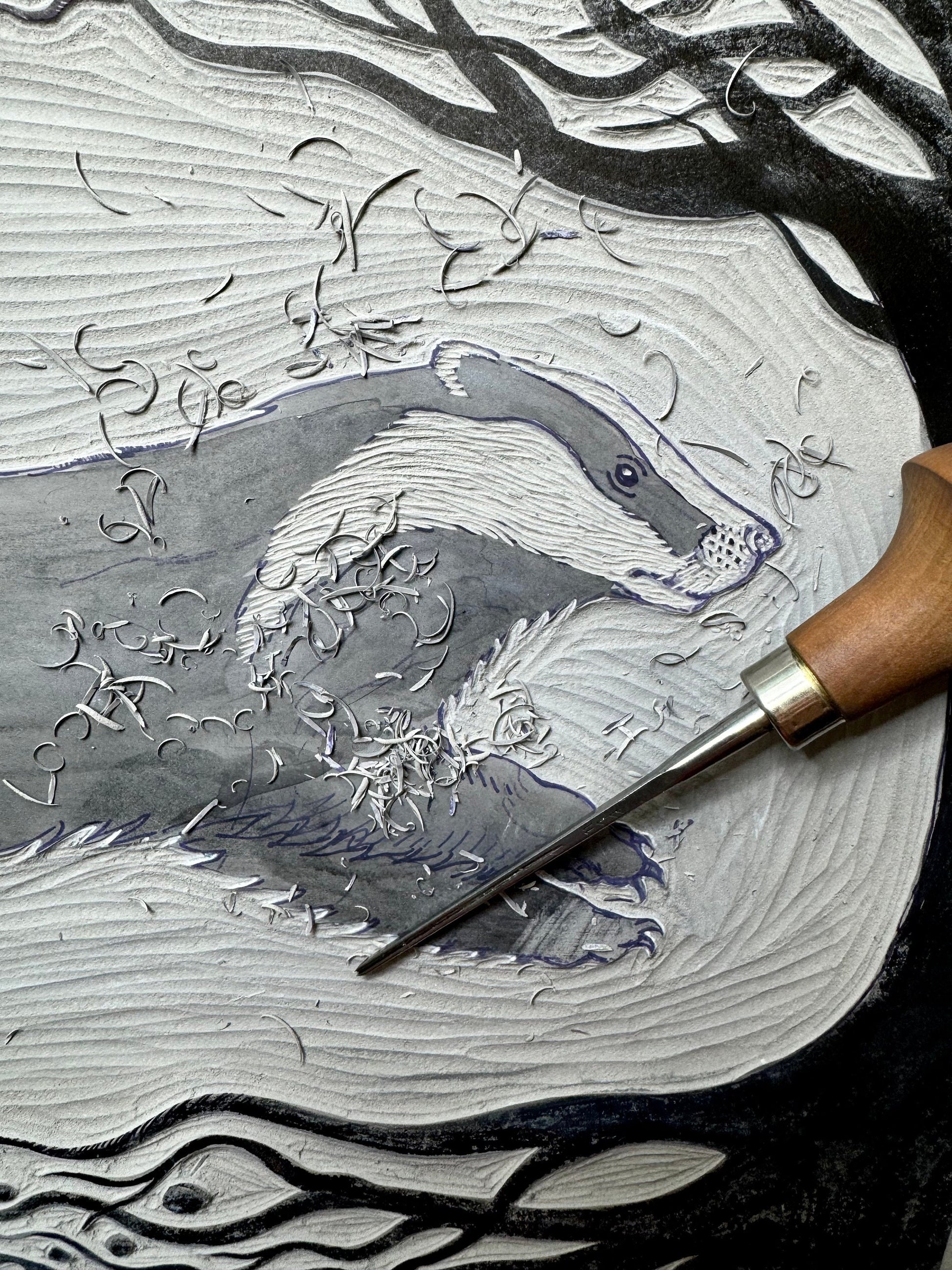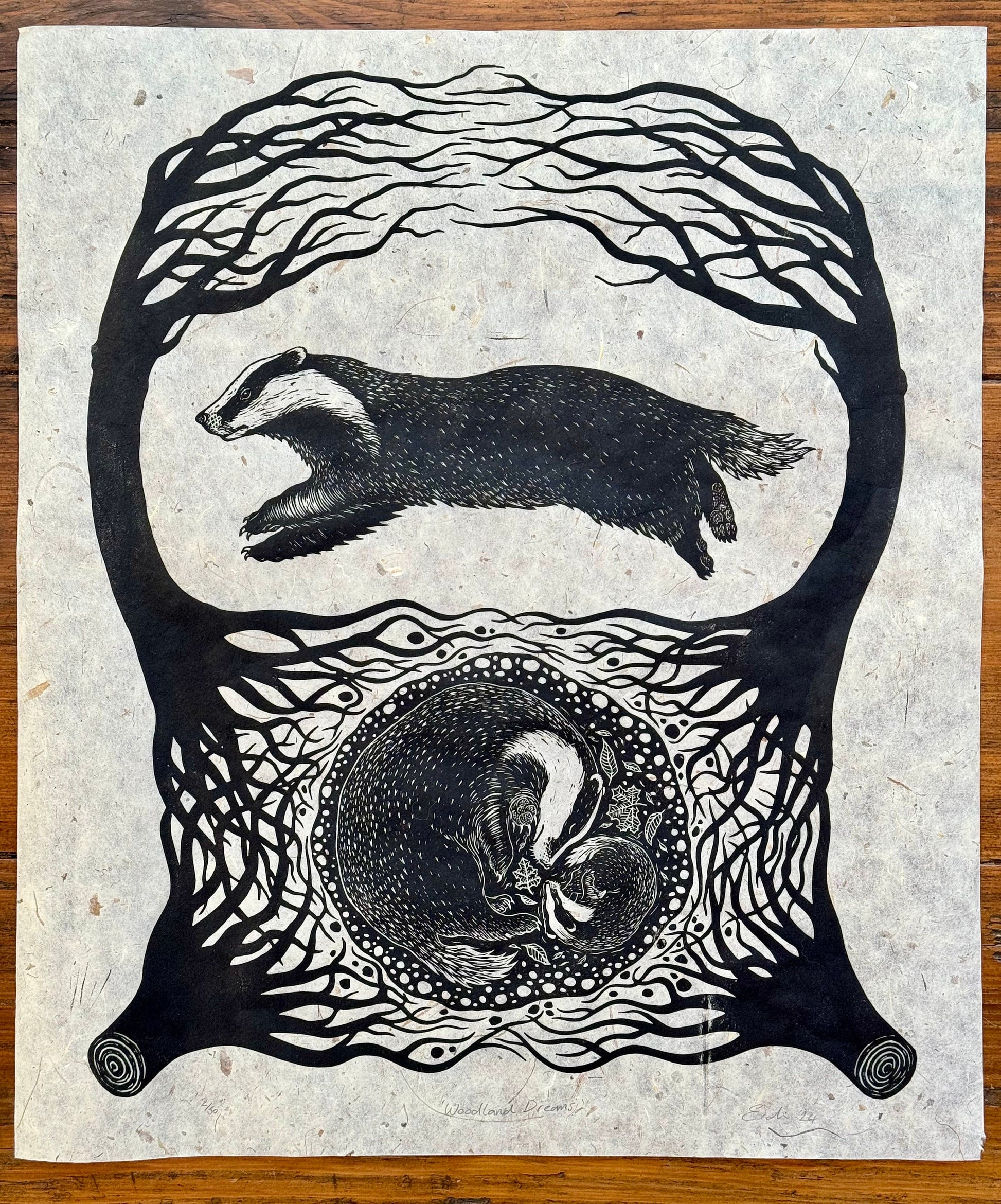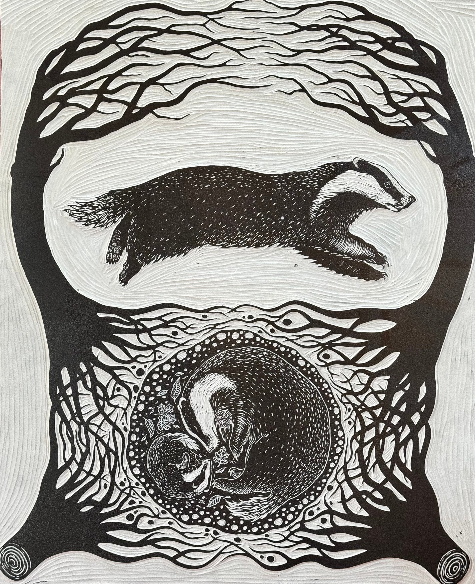 'Woodland Dreams' is a hand printed lino cut of badgers and tree roots/branches. The print incorporates two view points - one looking down on a sleeping badger and her cub, the other looking out at a badger galloping through the woods.